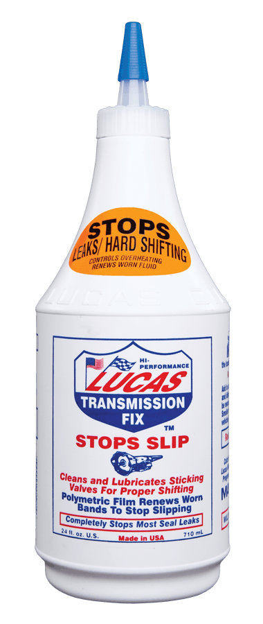 Lucas Transmission Fix contains no solvents or anything else that would be harmful to an automatic transmission. It is a thermal stable blend of petroleum-extracted additives designed to correct existing problems and prevent new ones in automatic transmissions. Lucas Transmission Fix stops slip, hesitation and rough shifting in worn transmissions. It completely eliminates most seal leaks and lowers operating temperatures in hard working units. A must for motor homes and commercial vehicles. Lucas Transmission Fix is excellent for preventative maintenance and will extend fluid life up to four times longer. It also extends needed protection to planetary gears. One 24 oz. bottle of Lucas Transmission Fix can be added to existing fluid without draining. A second bottle may be necessary in large or badly worn transmissions. In smaller transmissions (compact or sub-compact vehicles), use 12 oz. Lucas Transmission Fix is also excellent for light duty manual transmissions using automatic transmission fluid or motor oil as a lubricant. For easier shifting and extended transmission life drain transmission, install one 24-ounce bottle of Lucas Transmission Fix and top off with A.T.F. or motor oil.