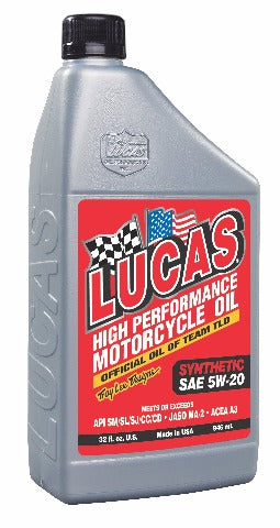 Lucas Synthetic SAE 5W-20 High Performance Motorcycle Oil is formulated with an exclusive additive package that is not found in other brands. It contains a high level of detergents and dispersants to resist sludge and varnish formation. Lucas Synthetic SAE 5W-20 High Performance Motorcycle Oil is formulated to lower engine temperature and raise oil pressure, reduce noise and increase performance. It offers maximum protection with minimum drag. The exclusive additive package in Lucas Synthetic SAE 5W-20 High Performance Motorcycle Oil allows for extended drain intervals. Lucas Synthetic SAE 5W-20 High Performance Motorcycle Oil far exceeds all OEM specifications. Formulated to meet ALL motorcycles that call for a Synthetic SAE 5W-20 motor oil. Meets or exceeds: API SM, SL, SJ, SH, SG, SF, CC, CD ? JASO MA/MA-2 ? ACEA A3