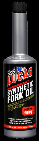 Lucas High Performance Synthetic Fork Oil Heavy (15 wt.) is formulated with the highest quality synthetic base oils and our unique additive system to improve performance and extend the life of your fork?s internal parts. Provides highly responsive handling and better shock behavior. Our High Performance Synthetic Fork Oil Heavy (15 wt.) prevents seal hardening, oxidation and oil thickening, foaming and static friction. Also, reduces thermal expansion and provides better wear protection. Designed for use in all systems, including damping rod, cartridge, bladder, conventional and inverted forks.