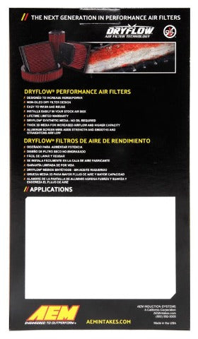 AEM Dryflow Air Filters are washable synthetic air filters designed for an optimum combination of air flow, filtration, and performance. They use an oil-free filtration material that allows easy cleaning and excellent filtration.