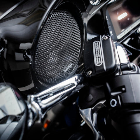 It is made water/weather resistant with the addition of a Santoprene front isolation spider connecting between the tweeter housing and cone assembly. The speaker requires no modification of the factory location and comes with new grille assemblies for both fairing and Tour-Pak applications.