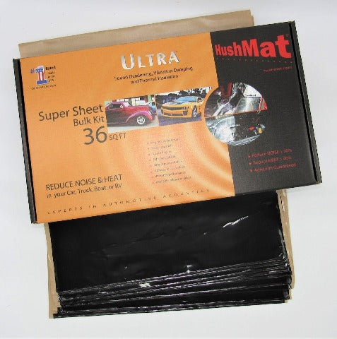 HushMat Ultra Super Sheet Sound Deadening and Thermal Insulating Material contains nine 32 in. x 18 in. sheets with Stealth Black Foil 36 Sq Ft. Reduce noise, heat and enjoy a more comfortable ride with Hushmat's new large size sheets!