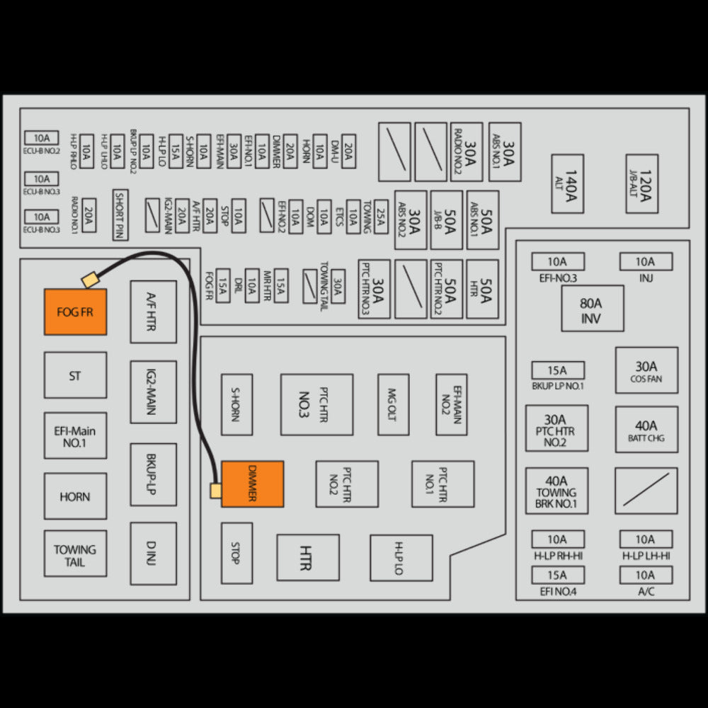 Brighten up your driving experience with this simple upgrade inside your underhood relay box. Simply install the All Lights On module to allow your high-beams and fog lamps to simultaneously illuminate the road ahead. Once installed the All Lights On module will keep your fog lamps on when you turn ON your high-beams. When the high-beams are NOT turned on your low-beams and fog lights will function normally. Installation Open the hood and remove the relay panel cover. Remove the relays labeled: FOG FR and DIMMER Insert the relays through the All Lights On boards with the wire connection facing towards the top of the relay. The board will make a firm connection with the relay. Reinstall the two relays back into their original location and install the relay panel cover. Operation MY2016-2023 Tacoma: High beams, low beams, and fog lights on when high beams are enabled. Application Fits 2016-2023 Toyota Tacoma with factory installed fog lamps See Instructions tab on this page for a link to the detailed installated instructions. * Protected under US Trademark Reg. No. 6,068,463, US Copyright Reg No. TXu 2-413-681, and US Patents Pending