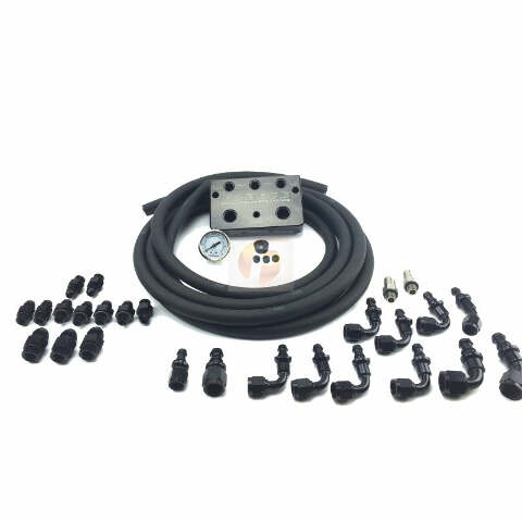 The two feed line ports allow you to run two lift pumps to ensure you always have enough fuel volume. Metric straight thread to AN fittings and hose are included to replace the aforementioned hard lines and plumb those returns to the regulated return distribution block (Note this kit does not include 1/2 inch (-8AN) or 3/8 inch (-6AN) fuel line to feed the distribution block or return to the tank).