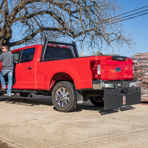 Your trailer takes plenty of wear and tear on the road without the scuffs, scratches and dents made by loose debris. The truth, however, is that this debris can quickly become a bombardment of damage that is otherwise easily preventable. The LUVERNE Textured Rubber Tow Guard is a simple trailer hitch attachment that provides a reliable barrier between your tow vehicle and trailer. The Tow Guard acts very much like a set of heavy-duty mud flaps. Only instead of merely covering your rear tires, it serves as a full-width wall at the rear of the vehicle, providing superior protection for the trailer. Also, unlike most mud flaps that are designed for permanent installation, the Tow Guard can conveniently be installed or removed as necessary, using a heavy-duty clamp system. This Tow Guard model attaches to virtually any 2" to 3" ball mount shank and maintains full use of your trailer hitch and any electrical components. The LUVERNE Tow Guard is constructed with a strong steel frame and heavy-duty recycled rubber flaps. The steel frame is covered in a highly durable textured black powder coat finish to protect it against scratches, chipping and rust, and the rubber flaps are made from a tough 3/8" thick textured rubber. Installing the Textured Rubber Tow Guard is as simple as bolting it onto a ball mount and mounting it on your receiver hitch. It attaches to the ball mount shank with a clamp mechanism and features cutouts in the steel frame for dual exhaust and for the trailer wiring connection. The Tow Guard is available in a universal width of 72" to fit most full-size pickups and SUVs and in two flap length options, including 15" and 20". When selecting the right length for your vehicle, we recommend a minimum gap of 4" when loaded and a maximum gap of 7" when unloaded. The Tow Guard comes fully factory-assembled and can easily be trimmed for a fully custom fit.