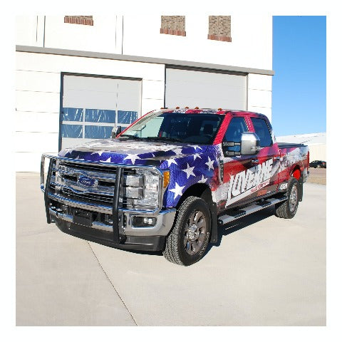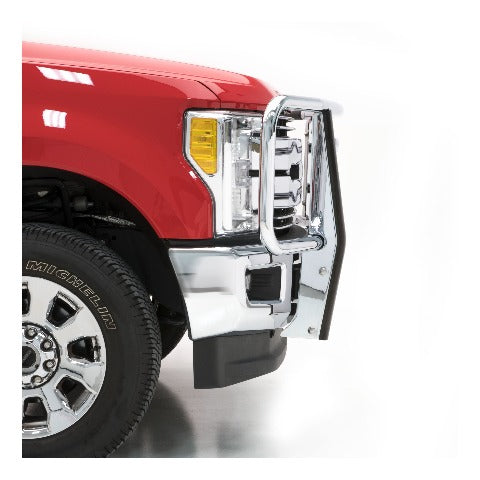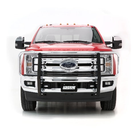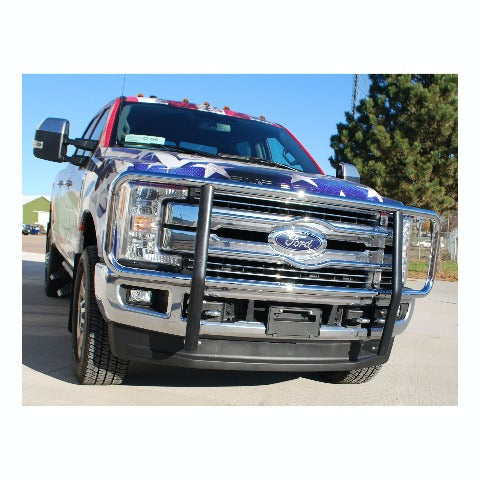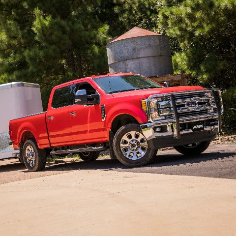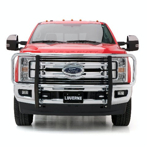 Adding accessories to your truck is all about highlighting and showing off its existing features, and no front-end accessory shows off these features quite like a LUVERNE grille guard. Our 2" tubular grille guard features our signature logo reveal and a vehicle-specific fit -- all to maximize front-end protection and truly make it all about your truck. It starts with our classic center section. The horizontal tubes are contoured to create our signature logo reveal, showing off your vehicle's badge with pride. The tubes also add extra protection for your vehicle's grille. To add some beef to the front end of your vehicle, the LUVERNE 2" brush guard is built tough. It is constructed from high-strength steel, assembled right here in the USA, to ensure the utmost quality. The frame-mounted uprights provide a solid structural base and are shielded with extruded rubber covers to better protect the finish. We also add a polished stainless steel backing to the uprights, giving them a clean, finished appearance that will outlast rust. Our 2" tubular grille guards are available in a durable textured black powder coat or a bright chrome-plated finish to suit the look of your own unique truck. To finish off the LUVERNE 2" steel brush guard and truly make it an accessory fit for your vehicle, we make each one vehicle-specific. This means no drilling necessary during the install and compatibility with your factory tow hooks on most models. This particular custom grille guard fits specific years of the Ford F250 Super Duty, F350 Super Duty, F450 Super Duty and F550 Super Duty (see application info to verify fitment). It mounts directly to the frame using strong steel brackets, and the brackets are covered in a black powder coat finish to ensure long-lasting durability. NOTE: Ring assembly and upright package included but shipped separately.