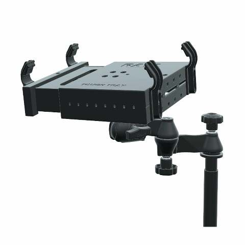 This configuration provides a telescoping feature that ranges from 12 to 18 inches. Dual swing arms provide articulation and 12 inches of reach for passenger and driver access to the mounted device. Patented rubber ball and socket joint provides additional adjustment as well as shock and vibration isolation. The RAM Tough-Tray™ is spring loaded to accommodate 10" to 16" wide laptops & (17" wide screens). The tray features four adjustable retaining arms with rubber grip feature. These arms can be moved both vertically and horizontally. This allows for a custom fit for varying thicknesses of laptops and the freedom of not blocking ports or drives. A screen support and USB light are also available to accessorize the tray. Hole patterns on perimeter of tray facilitate the mounting of additional RAM systems to support GPS or other electronics.