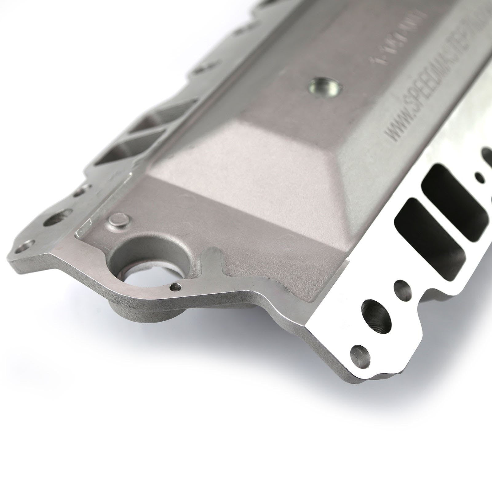 The Speedmaster MidRise Air design features the identical plenum and runner design as the normal MidRise. The main difference is that there is an open area under the plenum chamber. This feature is sometimes called an air gap design. The air flowing under the plenum provides a cooler charge for the incoming air with less heat transfer from the engine. This cooler air charge provides additional power and torque.