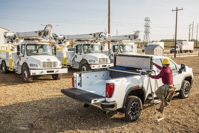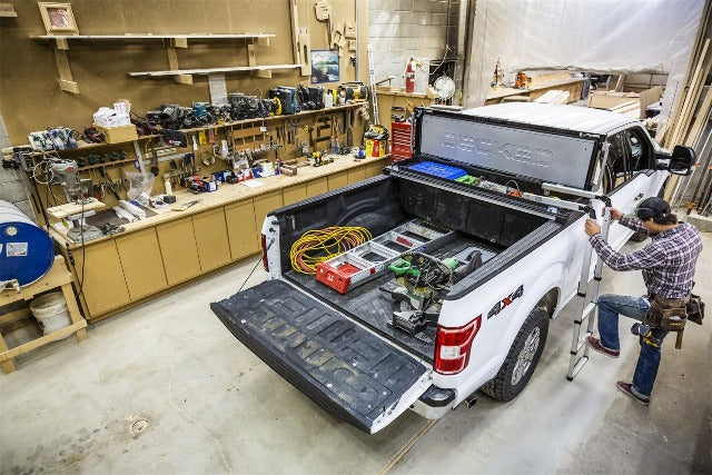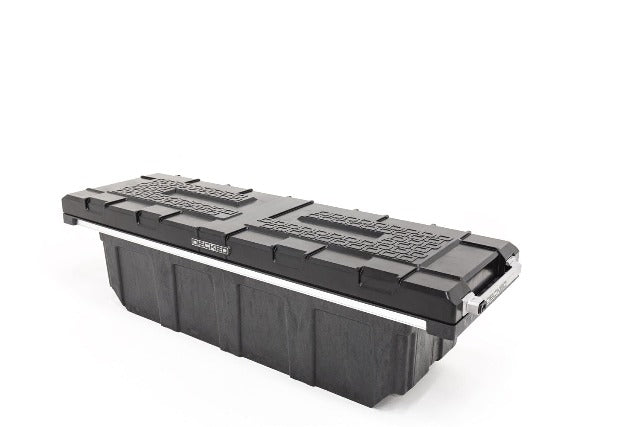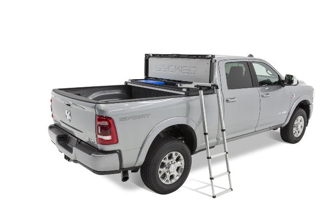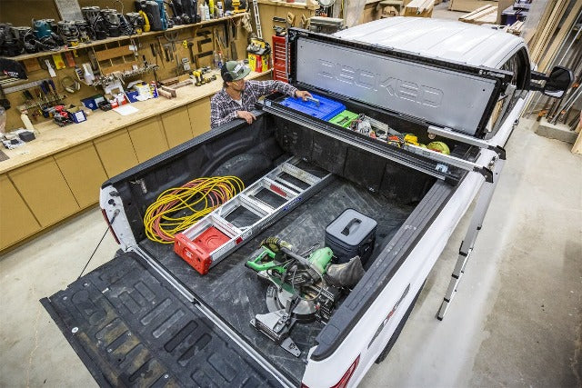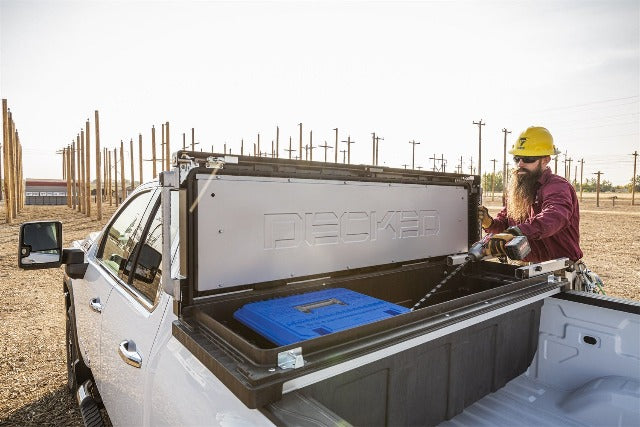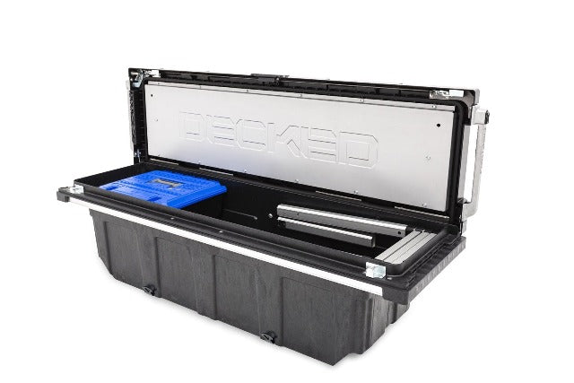 The DECKED Tool Box innovates truck bed storage. Made from high impact polymer resin and anti-corrosion treated steel hardware, the DECKED Tool Box is dent-proof, completely waterproof and built to last. Featuring an integrated and optional telescoping access ladder, it's the only toolbox whose contents can be accessed without climbing into the bed of the truck. Featuring robust security mechanisms actuated by a single keyed lock on the driver's side, contents are secured behind multiple layers of resin and steel. With it's low profile design, the view out of the rear window is nearly uninhibited for safety. Comes standard with a DECKED Snack Tray and DECKED D-Box for additional organization.
