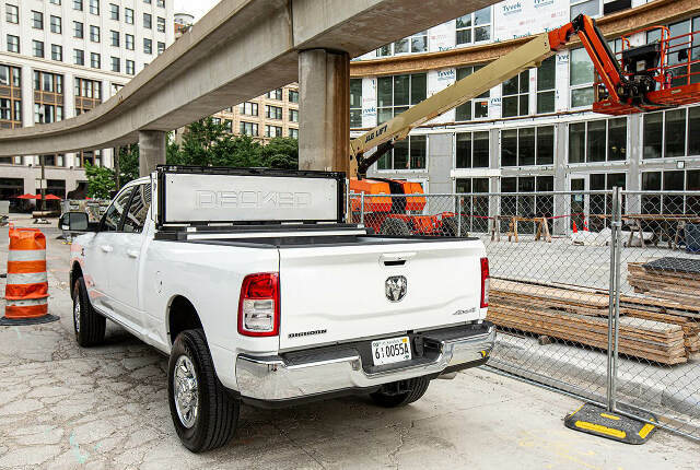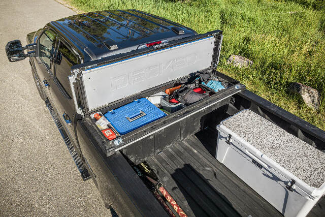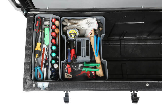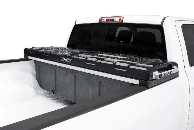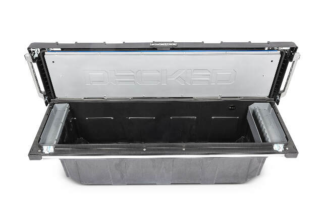 The DECKED Tool Box innovates truck bed storage. Made from high impact polymer resin and anti-corrosion treated steel hardware, the DECKED Tool Box is dent-proof, completely waterproof and built to last. Featuring an option to add a telescoping access ladder, it's the only toolbox whose contents can be accessed without climbing into the bed of the truck. Featuring robust security mechanisms actuated by a single keyed lock on the driver's side, contents are secured behind multiple layers of resin and steel. With it's low profile design, the view out of the rear window is nearly uninhibited for safety. Comes standard with a DECKED Snack Tray AND DECKED D-Box for additional organization.