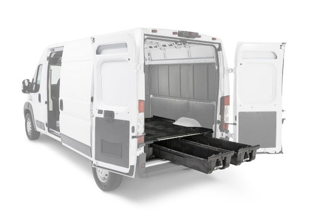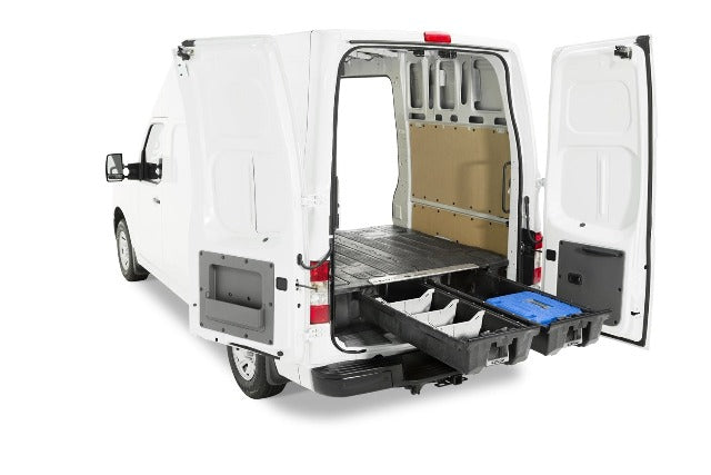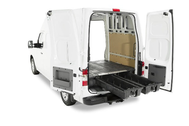 The DECKED in-vehicle storage system offers secure, weatherproof and organized storage with a sliding drawer toolbox system for cargo vans. 100% American made, the DECKED system features two secure, full bed-length drawers capable of carrying 200lb each that glide effortlessly on industrial-grade wheels beneath a 2,000lb payload-rated deck. Constructed from rugged High Density Polyethylene (HDPE) and steel, owners get ergonomic access to tools and equipment while maintaining full use of the cargo van floor's footprint. DECKED Cargo Van Storage Systems are perfect for contractors painters, carpenters, electricians. surveyors, plumbers and handyman services who need their cargo van to have secure storage bins that are easy to access. Toolbox drawers slide out tools, gear, and other items at waist height while still allowing full use of the van's cargo area. The system, once assembled, is easily installed and removed. Accessories are available for customizable storage. This system is compatible with Nissan NV cargo vans.