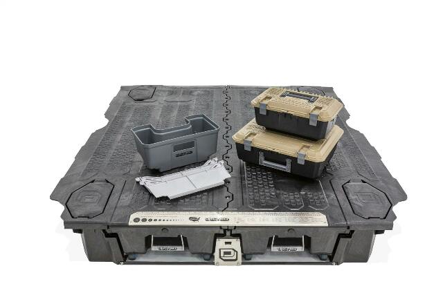 The DECKED in-vehicle storage system offers secure, weatherproof and organized storage with a sliding drawer toolbox system for pick up trucks. 100% American made, the DECKED system features two secure, full bed-length drawers capable of carrying 200lb each that glide effortlessly on industrial-grade wheels beneath a 2,000lb payload-rated deck. Constructed from rugged High Density Polyethylene (HDPE) and steel, owners get ergonomic access to tools and equipment while maintaining full use of the truck bed. DECKED systems are perfect for contractors, painters, carpenters, electricians, surveyors, plumbers, handyman services and the outdoor enthusiast who need their truck to have secure storage bins that are easy to access. The drawers slide out at waist height while still allowing the owner full use of their truck bed. The system, once assembled, is easily installed and removed. Accessories are available for customizable storage.