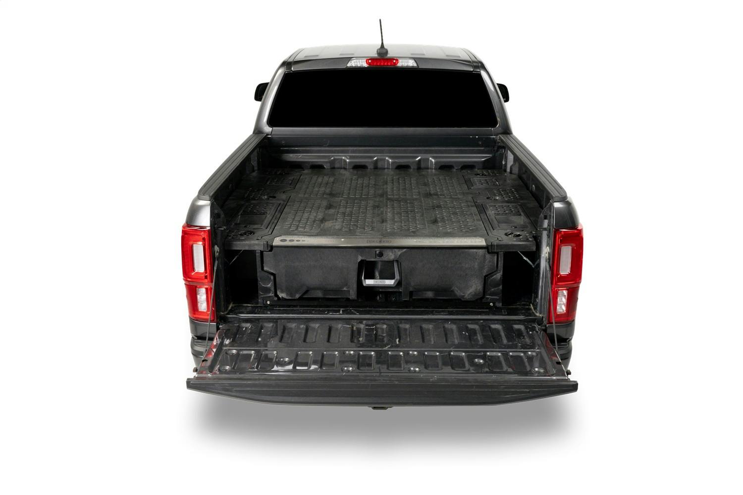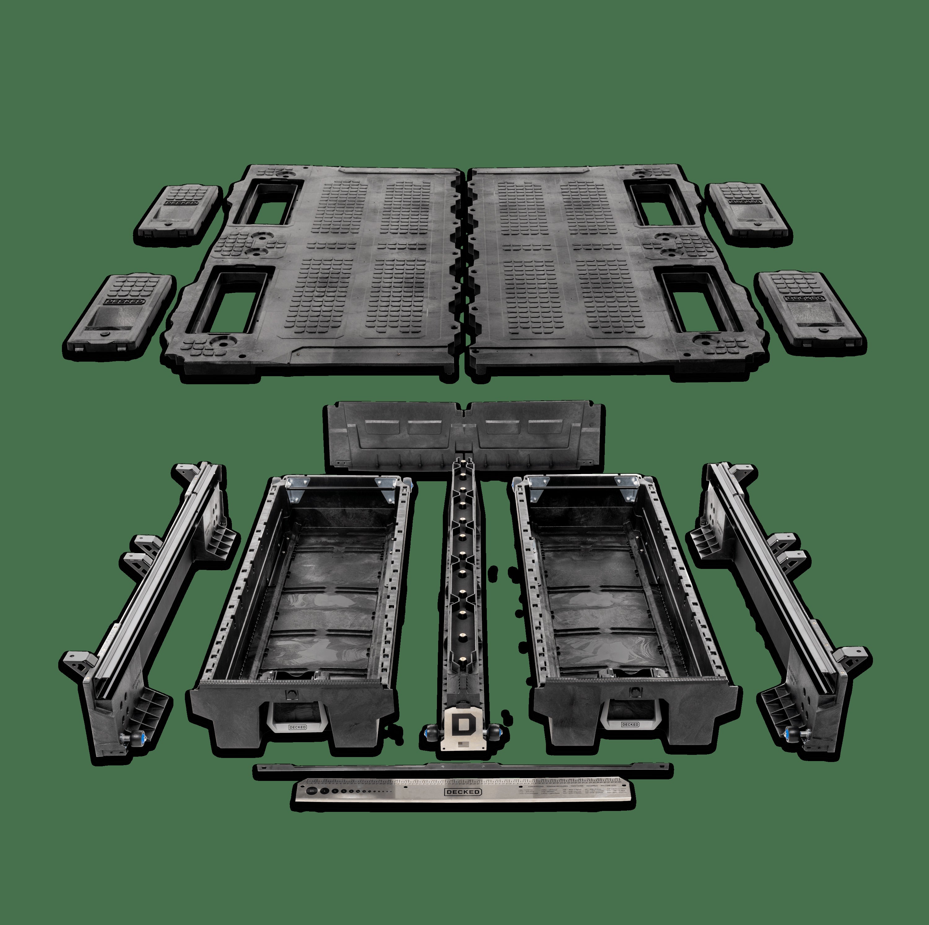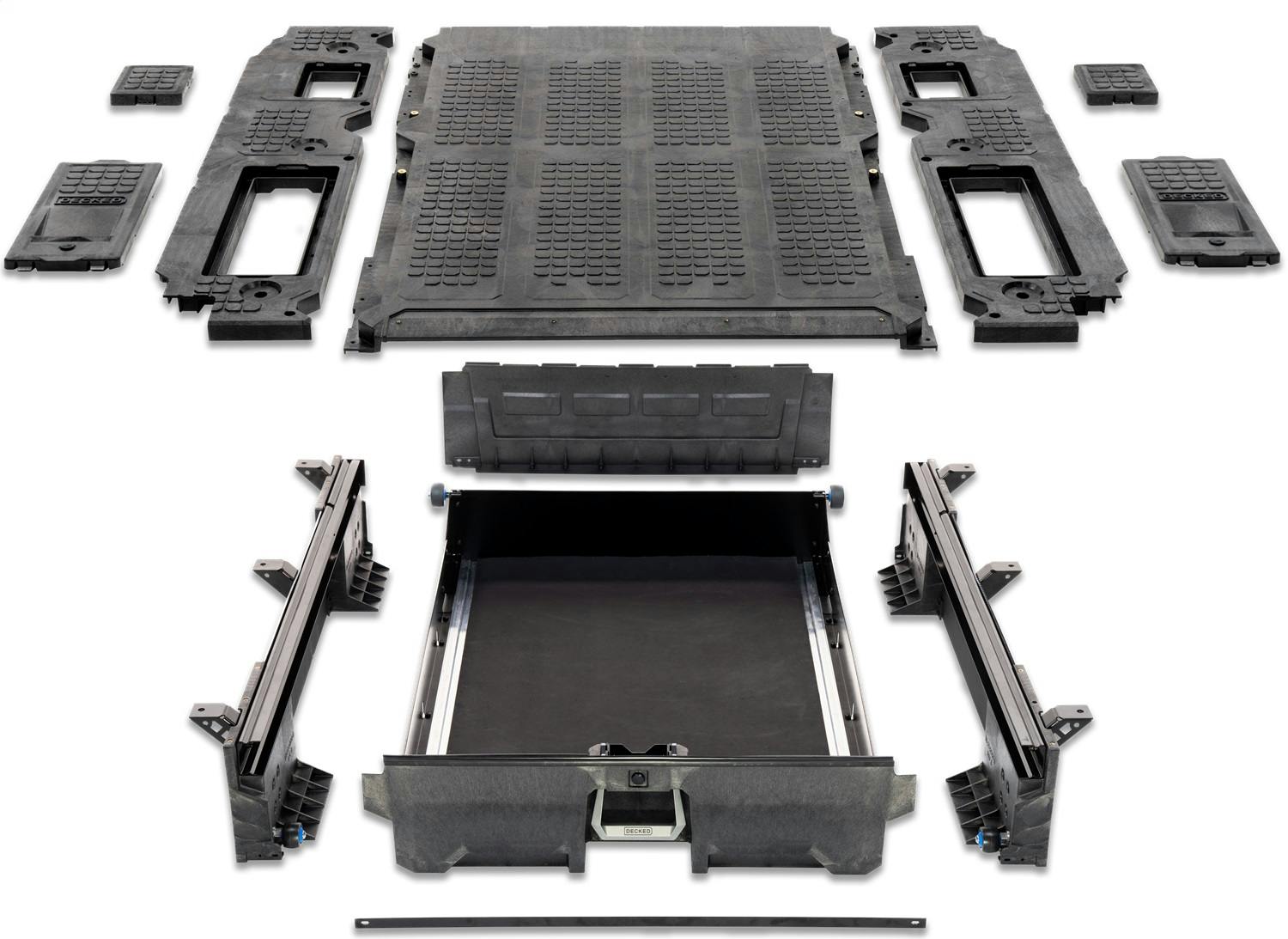 The DECKED in-vehicle storage system offers secure, weatherproof and organized storage with a sliding drawer toolbox system for pick up trucks. 100% American made, the DECKED system features two secure, full bed-length drawers capable of carrying 200lb each that glide effortlessly on industrial-grade wheels beneath a 2,000lb payload-rated deck. Constructed from rugged High Density Polyethylene (HDPE) and steel, owners get ergonomic access to tools and equipment while maintaining full use of the truck bed. DECKED systems are perfect for contractors, painters, carpenters, electricians, surveyors, plumbers, handyman services and the outdoor enthusiast who need their truck to have secure storage bins that are easy to access. The drawers slide out at waist height while still allowing the owner full use of their truck bed. The system, once assembled, is easily installed and removed. Accessories are available for customizable storage.