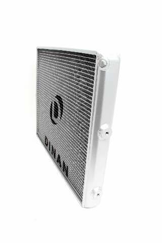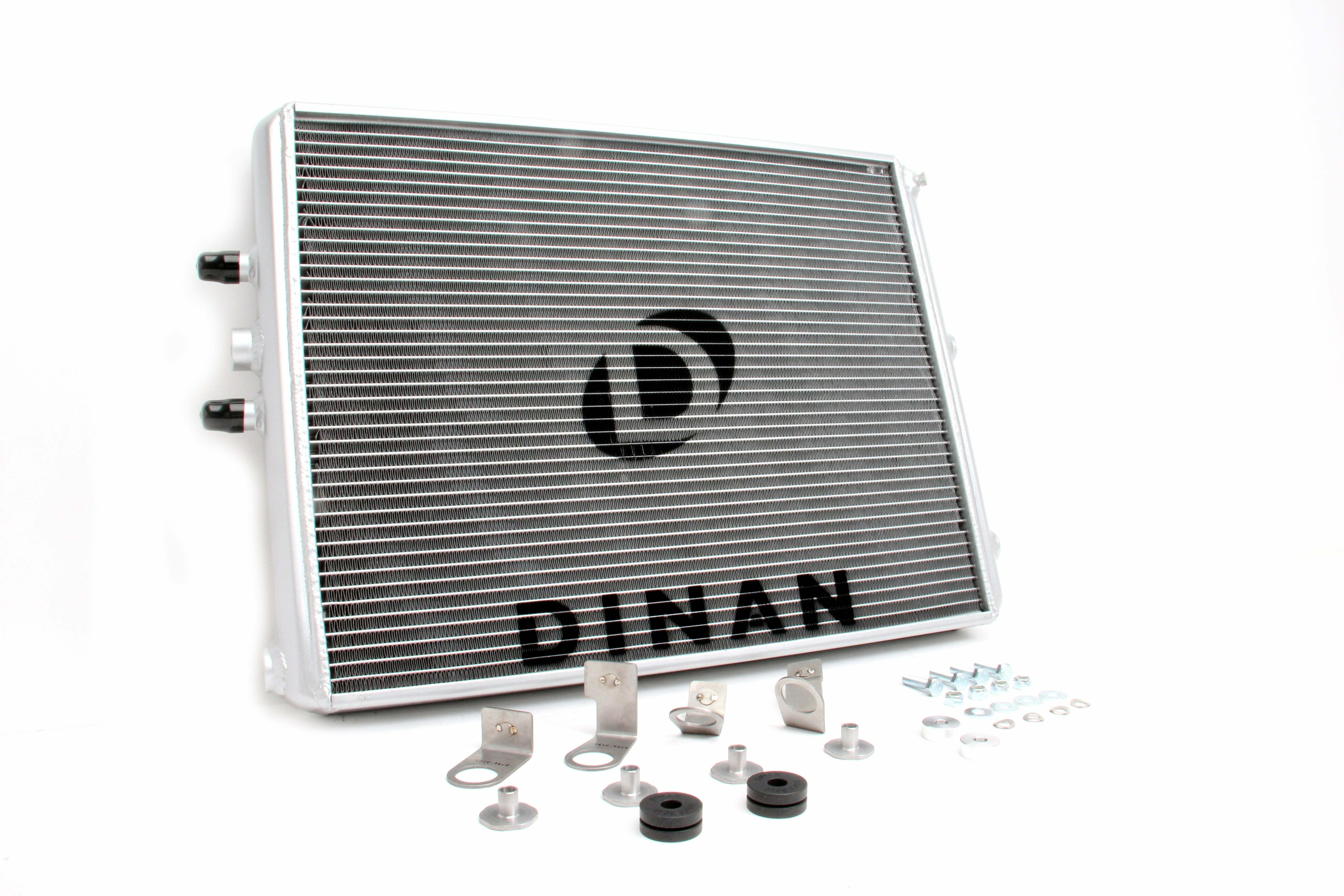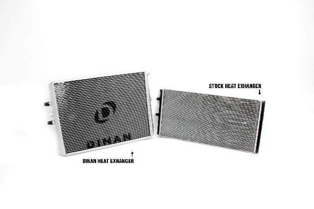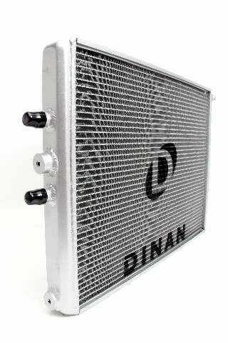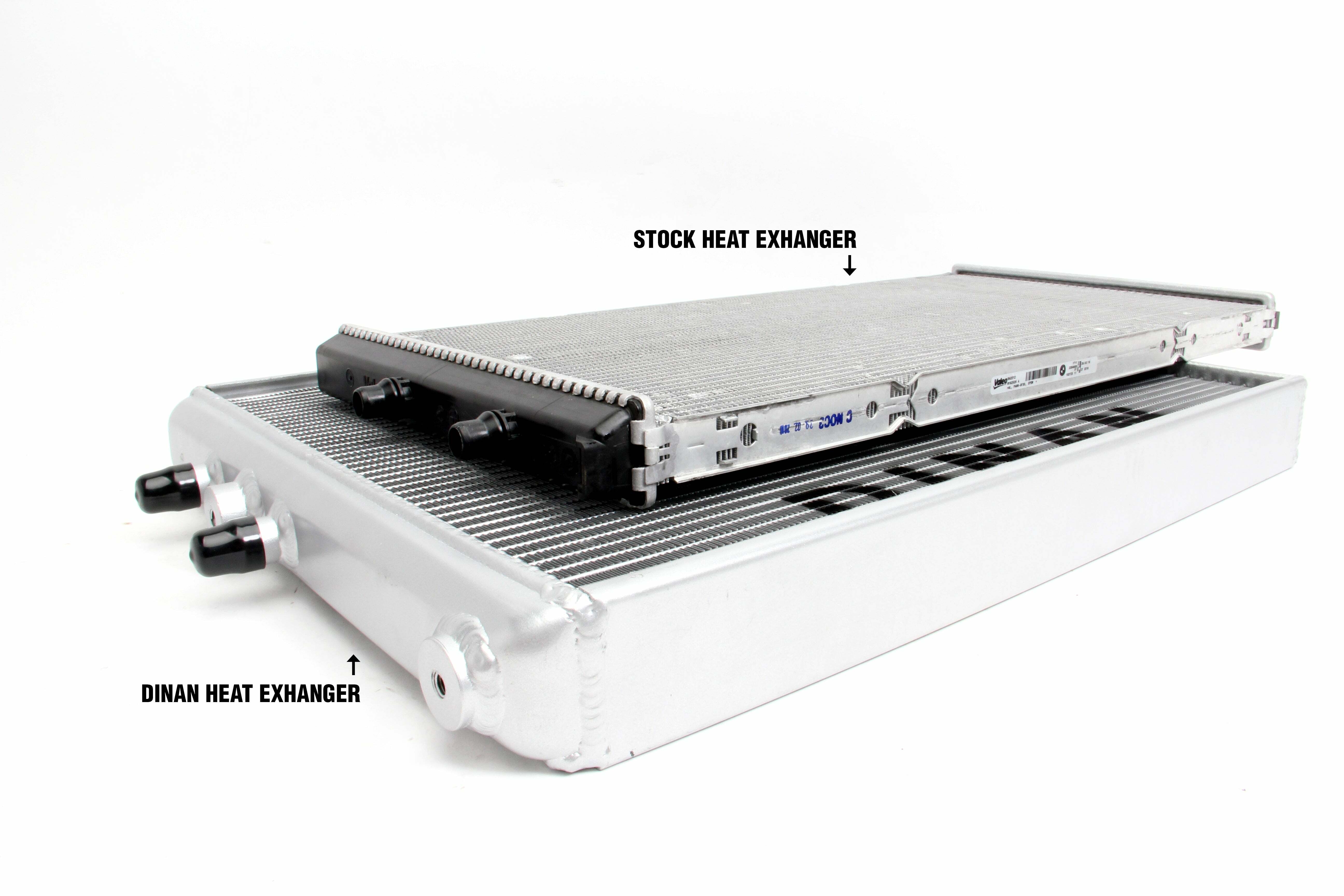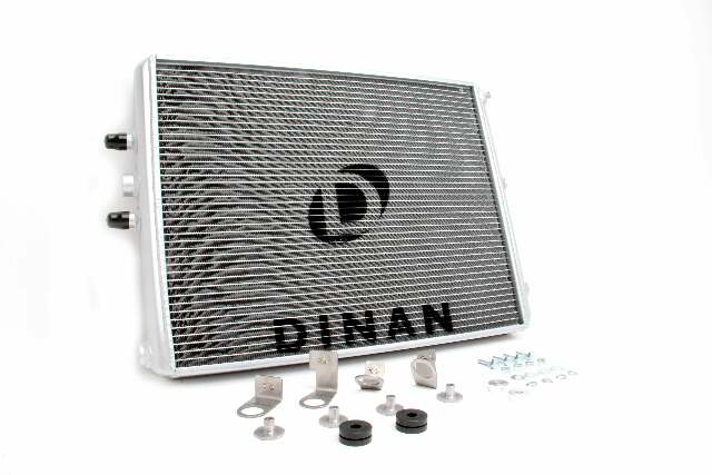 S55 HIGH PERF HEAT EXCHANGER K;Dinan High Performance Heat Exchanger - 2015-2020 BMW M2/M3/M4;F80/F82/F83/F87;Heat is the enemy of performance. Keep temps down and performance will go up as a result of increased efficiency. It's really as simple as that. In stock trim, testing made it painfully obvious that cooling was going to hold an even more vital role on the F8x (S55) platform to achieve maximum results. The stock cooling system heat soaks after only 3 pulls and allows the engine air intake temperatures (IAT) to rise dangerously. The ECU must then reduce engine power to prevent detonation. With the Dinan high-performance heat exchanger the vehicle does not heat soak even after 7 pulls; more than twice the effectiveness of a stock setup! Some may ask why change the heat exchanger and not the intercooler itself? Wouldn't it be more beneficial to go directly to the source of the charge air? The simple answer is yes, but at a cost. The stock system cools the intake charge by using a water-to-air intercooler, an expensive piece to engineer. The cooling circuit for the water that feeds the intercooler uses a primary cooler (heat exchanger) and a smaller secondary cooler in front of the passenger side wheel. Through rigorous testing of all 3 of those components and multiple combinations therein, it was discovered that the most effective performance per dollar solution was replacing the heat exchanger with a larger unit. Further testing focused on the heat exchanger produced the optimized design you see before you. With 60% more volume and 19% more face area than stock along with being a whopping 40mm thick (stock is 24mm), it becomes quickly apparent how heat soak is averted with the improved setup. While the unit could be physically thicker the 40mm dimension was ultimately chosen with consideration of airflow requirements of the main radiator which is located directly behind the heat exchanger. A thicker core would diminish airflow and sacrifice normal engine cooling which would be potentially detrimental to the long term health of the engine. The increased physical stature of the heat exchanger allows a reduction in water temperatures to the intercooler an average of 9° across the RPM range. The colder water entering the intercooler then improves is efficiency and allows the intake air to be cooled by an additional 6° average across the RPM range compared to the stock unit. The reduction in intake air results in an impressive 10 HP and 20 ft-lb of torque gain without any changes in the engine tune. The cooling unlocks some significant additional power when paired with the stage 3 DINANTRONICS Performance Tuner (where applicable).;More Power: Consistent +10 HP / +20 LB-FT of torque on the stock engine tune;60% more core volume & 19% more face area than stock;40mm thick Dinan cooler vs. 24mm thick stock cooler;9° average water termperature reduction to the intercooler across the RPM range. Colder water improves intercooler efficiency and allows the intake air to be cooled by an additional 6° average across the RPM range compared to stock;Significant reduction in tendency to heat soak;Rubber mounted for vibration isolation;Track tested to ensure consistent performance under extreme conditions