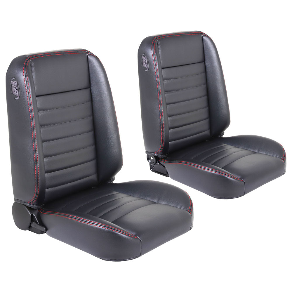 Bucket Seat TMI Pro-Classic Bucket Seats, Cruiser Collection 47-9250-2295-RS TMI Pro-Classic Bucket Seats, Cruiser Collection Universal, Black Madrid Vinyl W/Red Stitch 47-9250-2295-RS TMI's Cruiser Collection seats are meticulously hand crafted in-house with a focus on quality. Every step is painstakingly taken to create a comfortable, durable, long lasting automotive seat, at a great value. Fully assembled and 100 percent ready to bolt-in with TMI mounting brackets, these Cruiser Collection Seats are the perfect complement to your vehicles factory door panels while adding style and comfort to your interior. Classic styling with modern bolstering that offers exceptional support and comfort. Color: 2295 Black Premium polyester foam backed vinyl Contrast stitch options: Red, White, Blue, or Black. Fully welded one-inch diameter mandrel bent steel frames with an adjustable seat back to fully recline your seat. Proprietary TMI Molded Foam blend that meets low VOC UL Greenguard Gold standards with an FMVSS 302 Fire-Retardant rating. Seat Dimensions - Height: 26.5 inches (mounting tracks add 2 inches to the height) - Width: 22 inches - Length of Base: 23.5 inches Sold as a pair with slider tracks to fit most applications. Seat mounting brackets sold separately. Additional colors available to customize in our Pro-Series line.