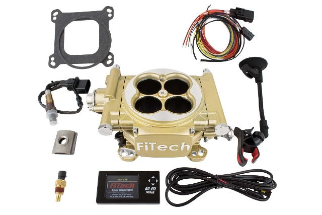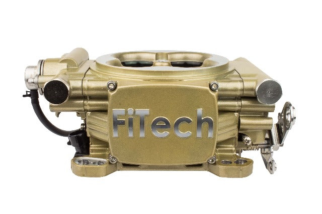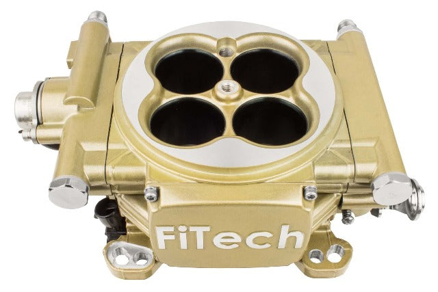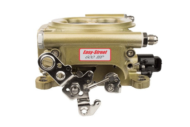 The Easy Street EFI System Kit is a FiTech Fuel Injection System rounding out the Street Series line. The Street Series includes the 150??400 HP Go Street, the 200??800 HP Meanstreet, and now the 250??600 HP Easy Street specifically designed for naturally-aspirated engines. With a classic gold finish, the Go Street Series EFI System may have the looks of a factory carburetor, but the similarities end there. The pre-programmed assembly bolts right into place on the squarebore intake manifold and requires only a minimum of inputs to fire up. The Easy Street accepts the tach signal from the coil negative, an HEI distributor, or from a CD ignition box for a simple installation. A fast-reacting wideband O2 sensor is supplied in order to monitor the fuel burn, which signals the self-learning technology of the ECU about adjustments to the mixture. This results in smooth performance anywhere from idle to high rpm's.