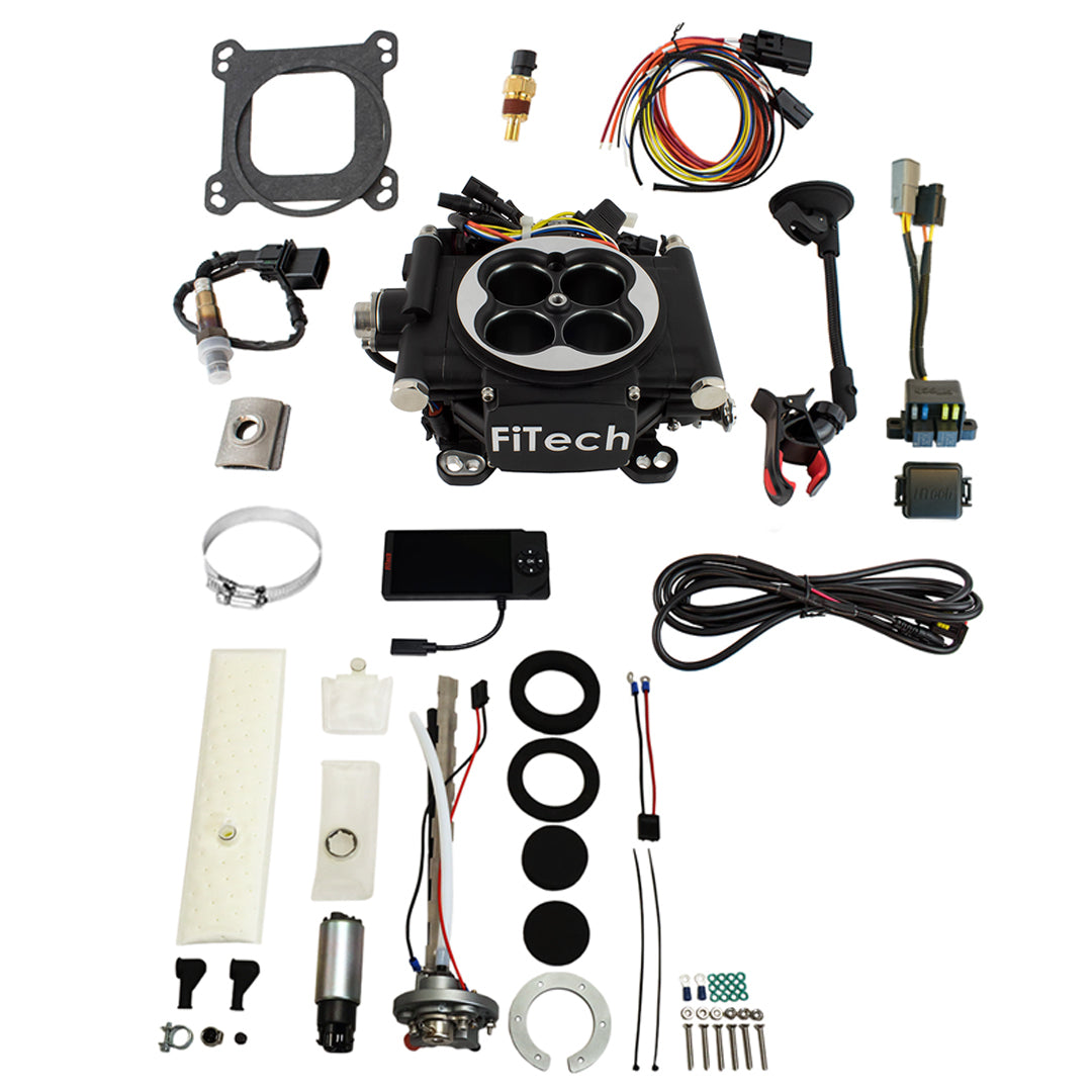 The ultimate solution for fuel management and delivery : FiTech's Master EFI Kits. Seamlessly integrating an advanced EFI system with a perfectly paired fuel delivery setup these master kits redefine performance and reliability. Experience enhanced horsepower optimized fuel efficiency and effortless startups. With FiTech's cutting-edge technology this all-inclusive package eliminates the guesswork offering a comprehensive solution for enthusiasts all in one box. Unleash the power of electronic fuel injection while ensuring a seamless and reliable fuel supply. Elevate your driving experience with FiTech Master EFI Kits : where precision meets power in perfect harmony.When it comes to fuel injection versus carburetors new school is just too cool. FiTech Go EFI self-tuning fuel injection systems have the ECU mounted on the throttle body for greater self-containment clean installation and easy setup. These trick systems fit any 4-barrel intake manifold and are designed for use on engines from 250 to 1200 hp. They feature a built-in fuel pressure regulator an ECU that finds the best tune and self-adjusts to it. Each system has a hand-held controller with a touch screen for initial setup throttle linkage that suits most transmissions and is manufactured with OE engineering. FiTech Go EFI self-tuning fuel injection systems leave the guesswork behind. Order the model with options best-suited for your application.
