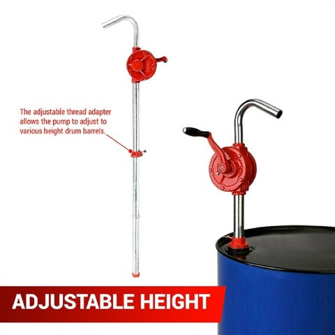Transferring liquid out of a drum barrel can be a pain! Safely use this portable TERA PUMP TRWS25. Manual Siphon Pump to transfer or empty tanks, barrels, drums, carboys and IBCs. The TERA PUMP TRWS25 is an affordable manual rotary drum barrel transfer pump made of cast iron and steel with precisely machined iron vanes. It is designed for quick and easy emptying of drums and the telescopic suction tube is adjustable to fit into drums of various sizes, from 15 gallons up to 55 gallons. It has a flow rate of 1.3 gallons per 20 turns, which is equivalent to pumping up to 10 gallons per minute. The TRWS25 eliminates the lifting of large, heavy, drums and spilling wasted fuel. Up and down operated flexible spring type bellows allow smooth operation and high powered discharge. This model works great with farm equipment, industrial vehicles, or in automotive shops. Do not use with water.