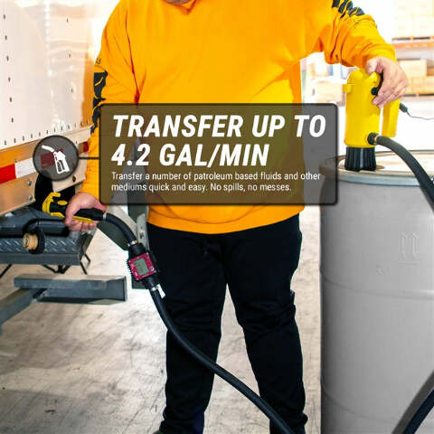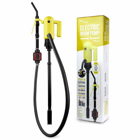 TREDRUME-M Electric Drum Pump with Flow Meter flows up to 4.2 GPM. Fits 15, 30 & 55 gallon drums. For gasoline, diesel, DEF (AdBlue), water, kerosene, antifreeze, windshield washer fluid, mild detergents, agriculture chemicals & light oils.