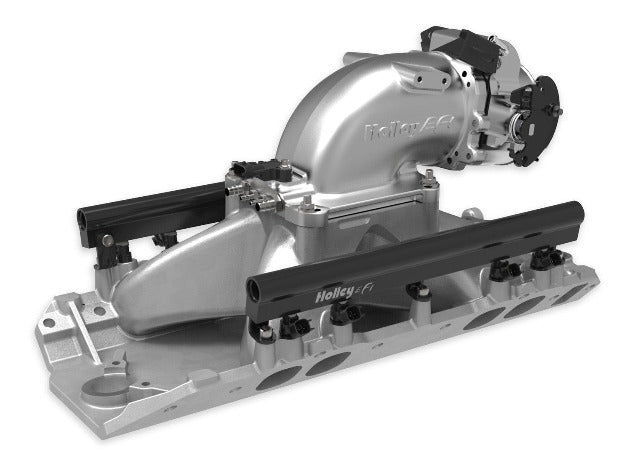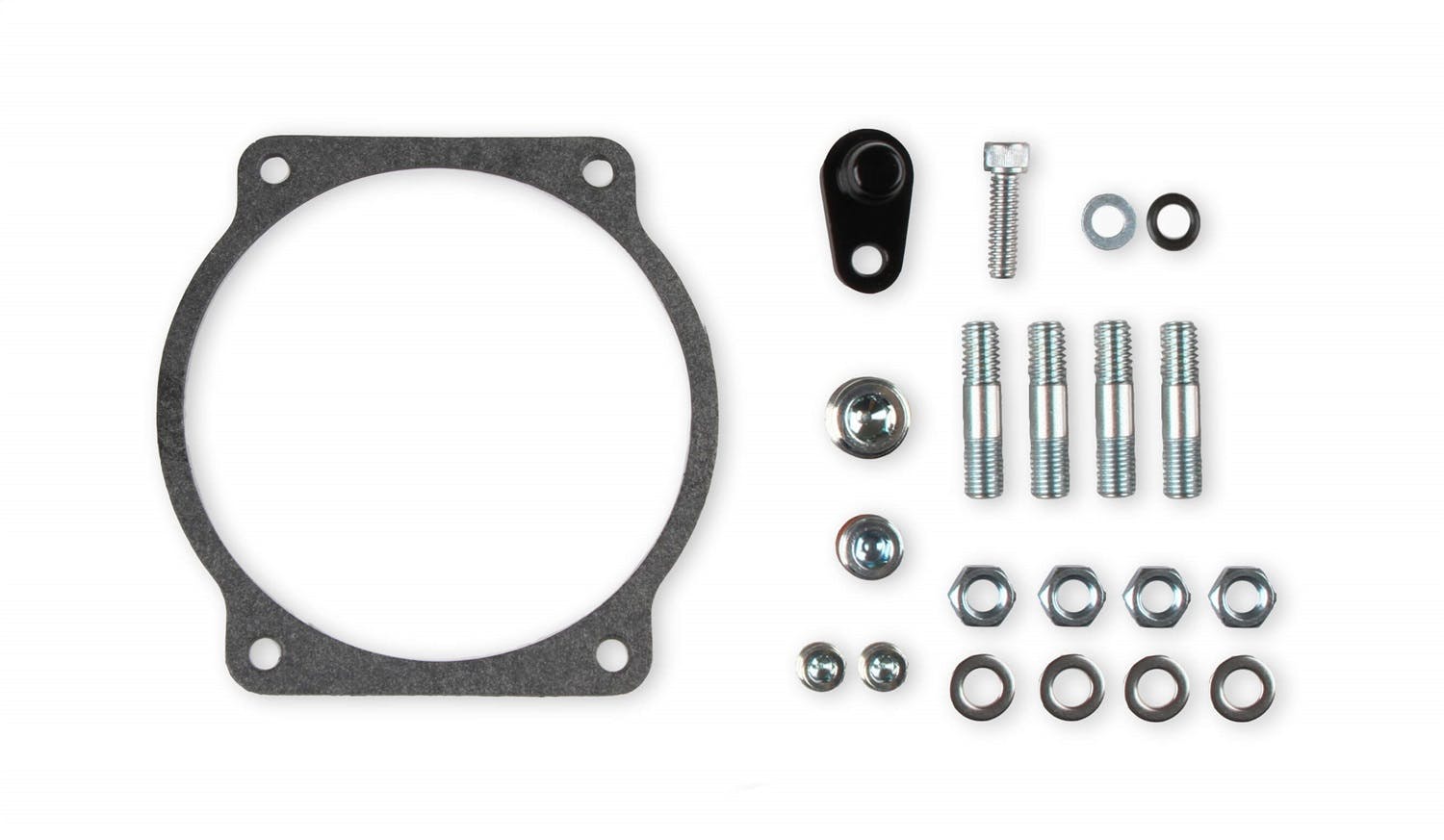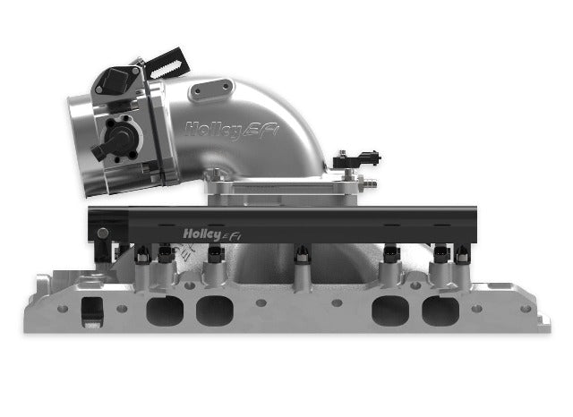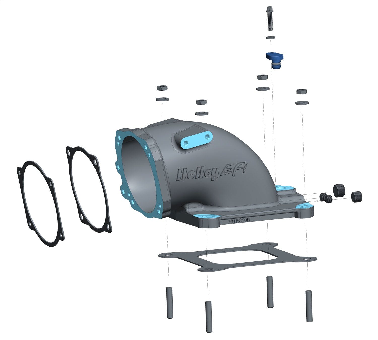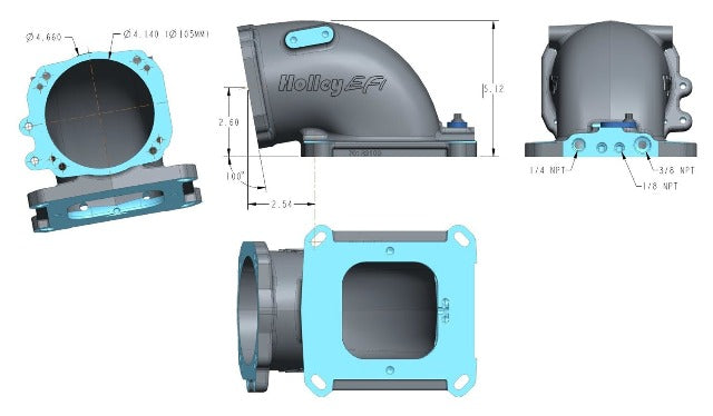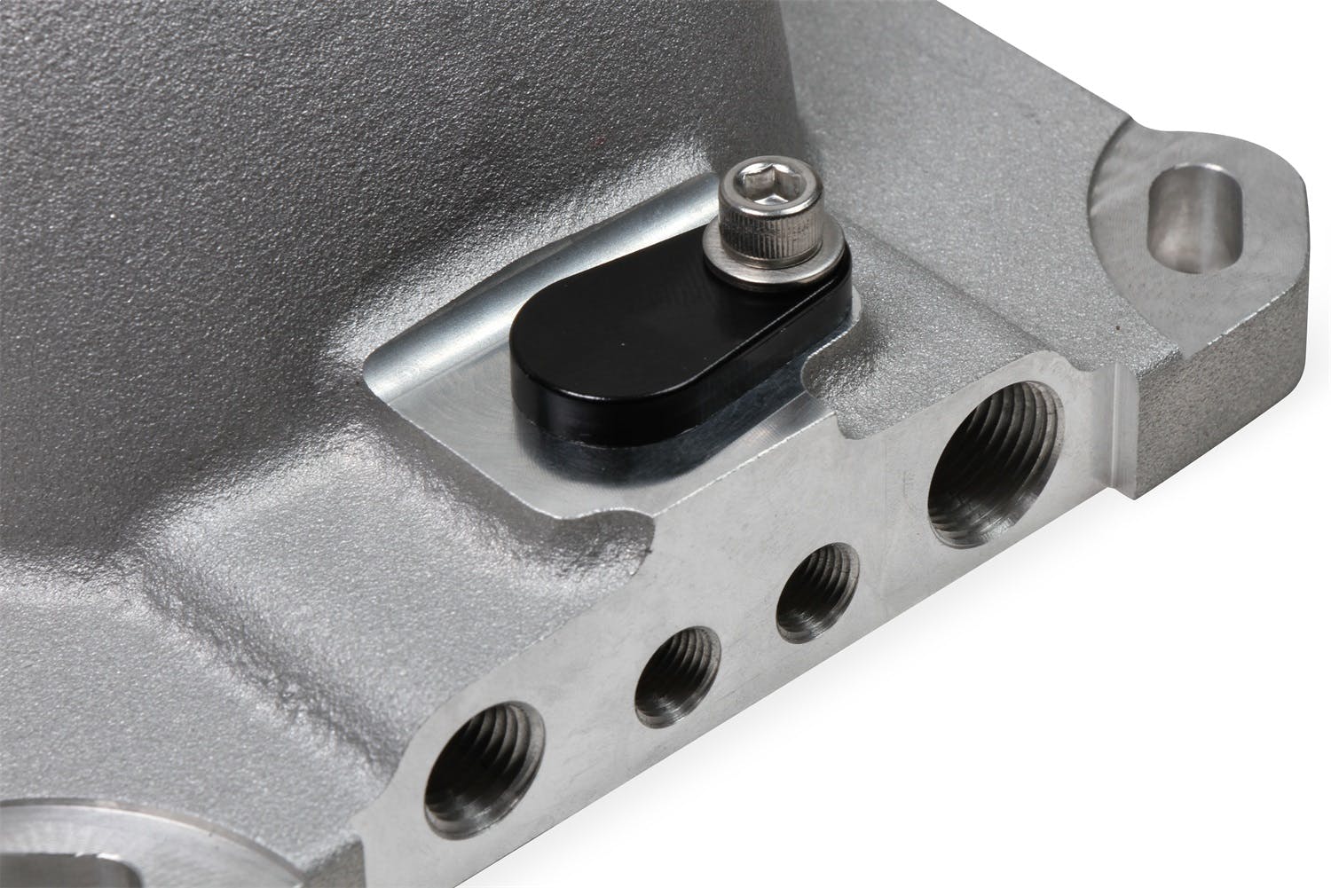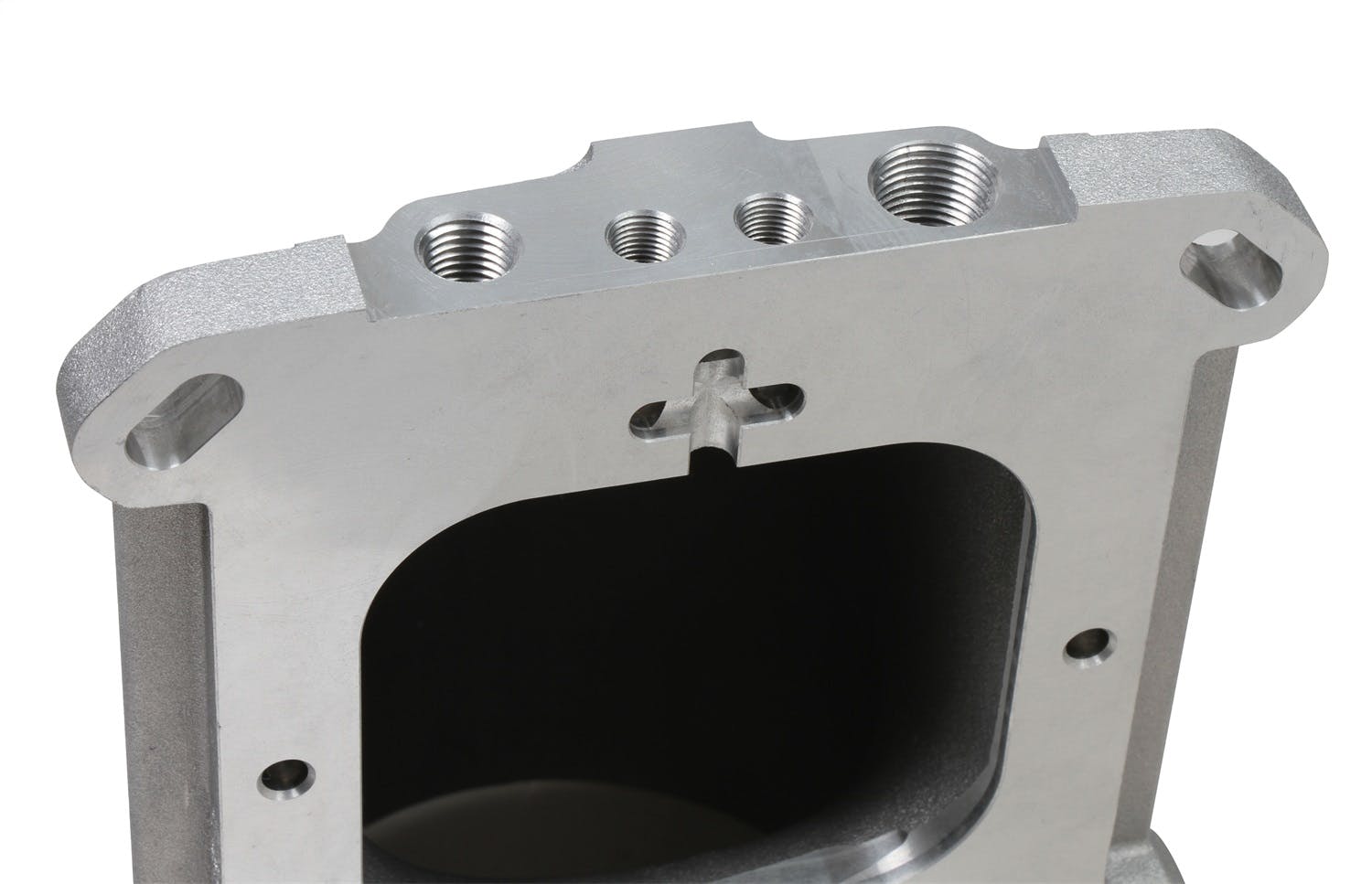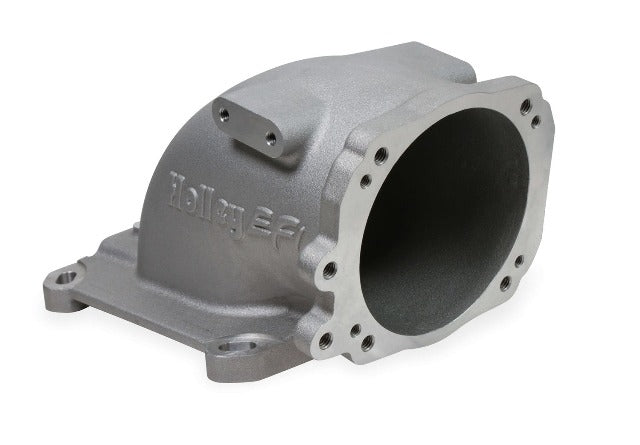 This cast EFI intake elbow allows the use of GM LS or Ford 5.0L throttle bodies on any intake manifold w/ the 4150 mounting flange. Slotted mounting holes & dual throttle cable mounting bracket bosses allow the elbow & throttle body to be mounted forward, sideways, or rearward. Features (4) vacuum ports, MAP sensor port, machined / port matched to 4150 gasket, and 100° throttle body angle for extra hood clearance.