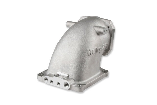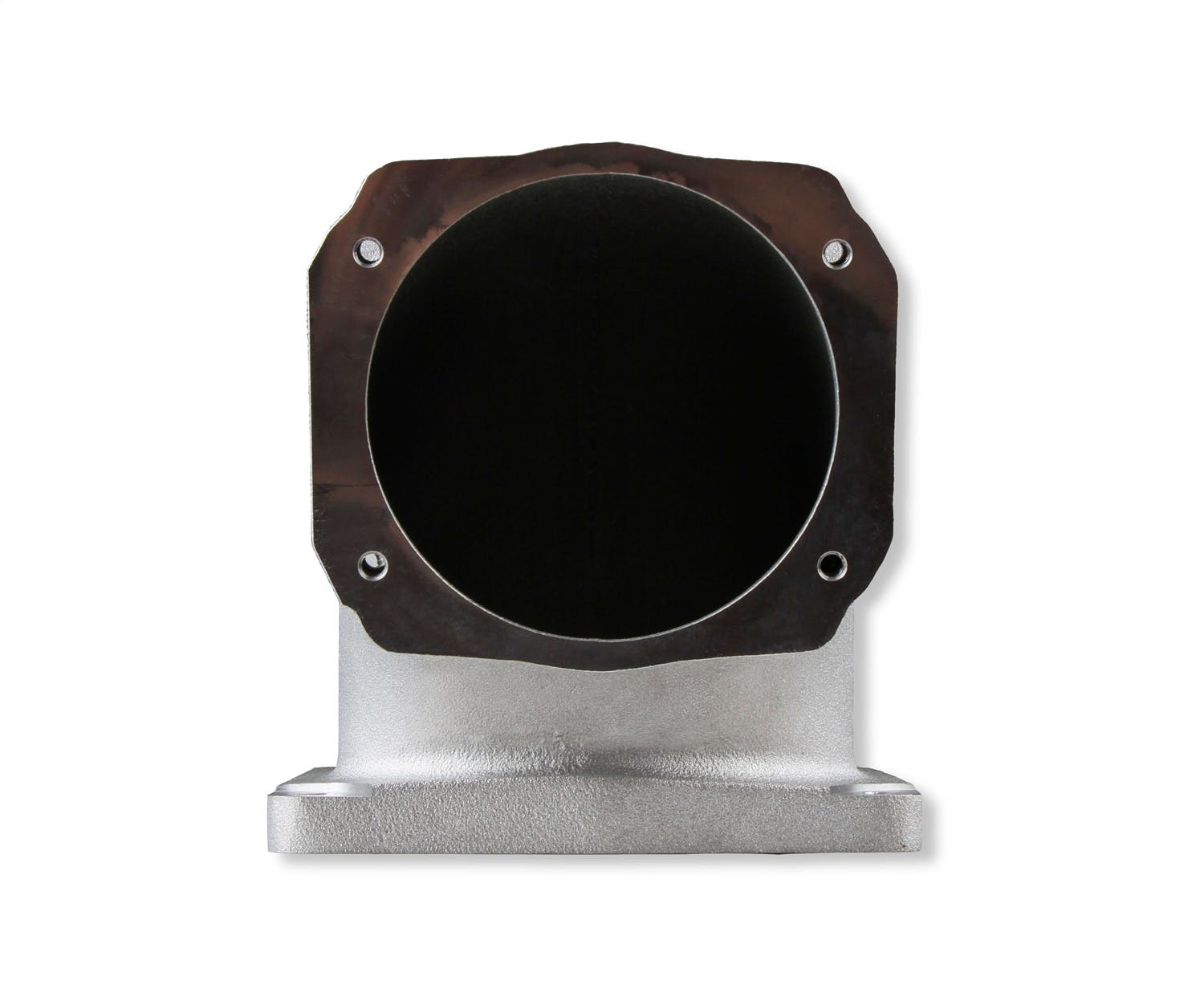 These cast aluminum EFI intake elbows allow the use of GM LS throttle bodies on any intake manifold w/ the 4500 mounting flange. Our design incorporates an optimized transition from the throttle body to the intake plenum for maximum airflow and distribution. Dual throttle cable mounting bracket bosses are included while the 4500 flange pattern allow the elbow & throttle body to be mounted forward, sideways, or rearward. The throttle bracket is included. Features (4) vacuum ports, MAP sensor port, machined / port matched to 4500 gasket, and 100° throttle body angle for extra hood clearance. Includes billet MAP sensor port cover, gaskets & hardware. The port design spacing will also allow a transducer to be used if a MAP sensor is not needed. The intake flange has an o-ring groove for a positive flange seal and the o-ring is included as well.