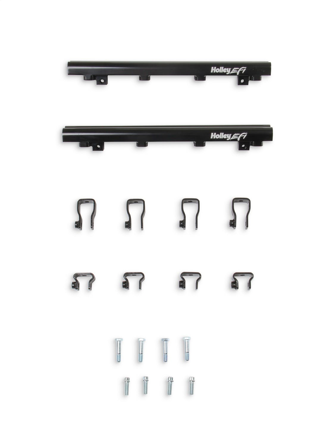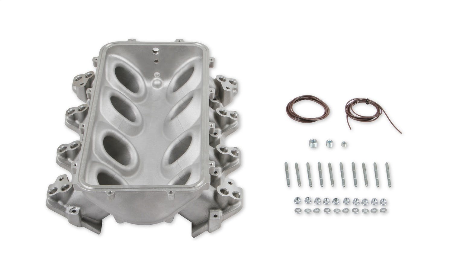 The Holley LS1/2/6 Lo-Ram intake manifold kits are designed for GM LS Gen III and IV engines equipped with GM LS1/2/6 (cathedral port) cylinder heads. These intake manifold and rail kits will work with OE (Original Equipment) or aftermarket cylinder heads. The 300-601 & 300-601BK front-feed, base-lower intake manifold provides two injectors per cylinder for hi-volume fuel demands, flexible fuel supply strategies, and dual-fuel capability. Offering this base intake manifold with fuels rails separately allows you to select your components individually as you build your induction system. Complete top-feed manifold kits are also available with dual fuel injectors, see P/N's 300-624 & 300-624BK. The top-feed, short runner, low-profile base intake manifold was conceived to package with an air to water plenum mounted intercooler with a shorter overall height than possible with other existing intake manifolds. Top-feed throttle body tops are available as a machined casting 300-246 & 300-246BK which are configured for a 105mm throttle body, see Holley P/N 112-581 or similar models. The fuel rail kits come with two sets of brackets. A set for long (usually standard length) fuel injectors and a set for short (such as Pico, or LS7) fuel injectors. Holley Lo-Ram intake manifold kits include all the sealing o-rings, plugs, and fasteners required for the installation of the kit.