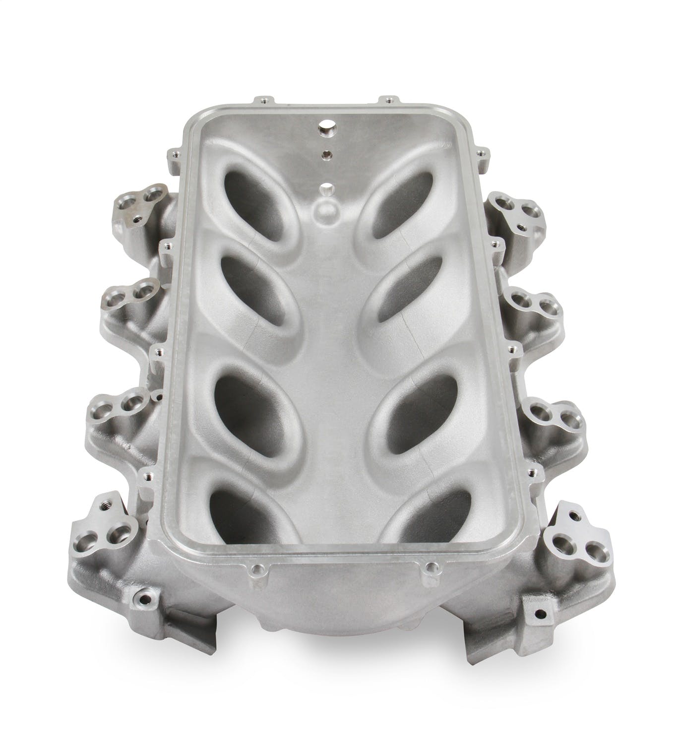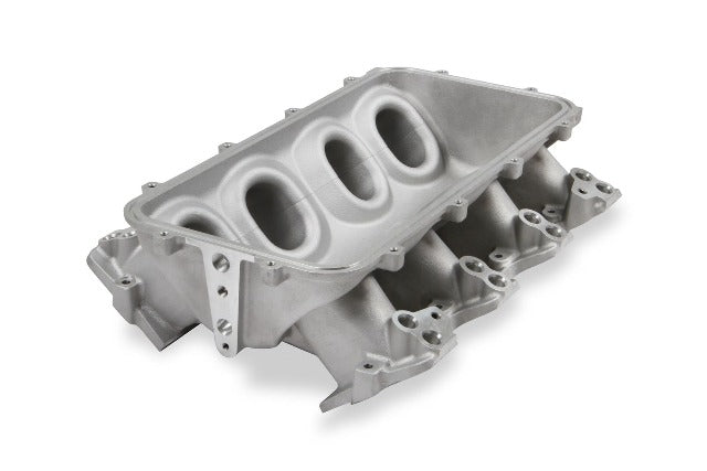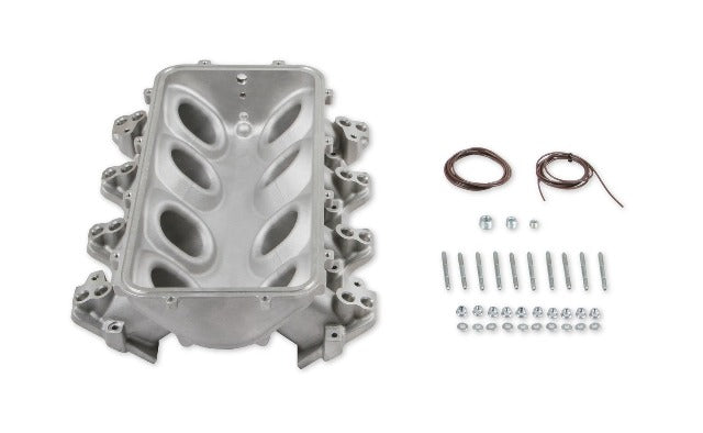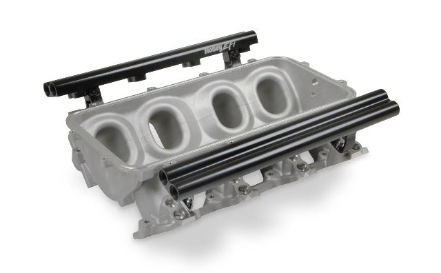 Holley EFI Lo-Ram Intake Manifold Base; Lower; w/Fuel Rails; Satin Silver Finish; For Use w/GM LS Gen III And IV Engine w/GM LS1/2/6 w/Cathedral Port Cylinder Heads;