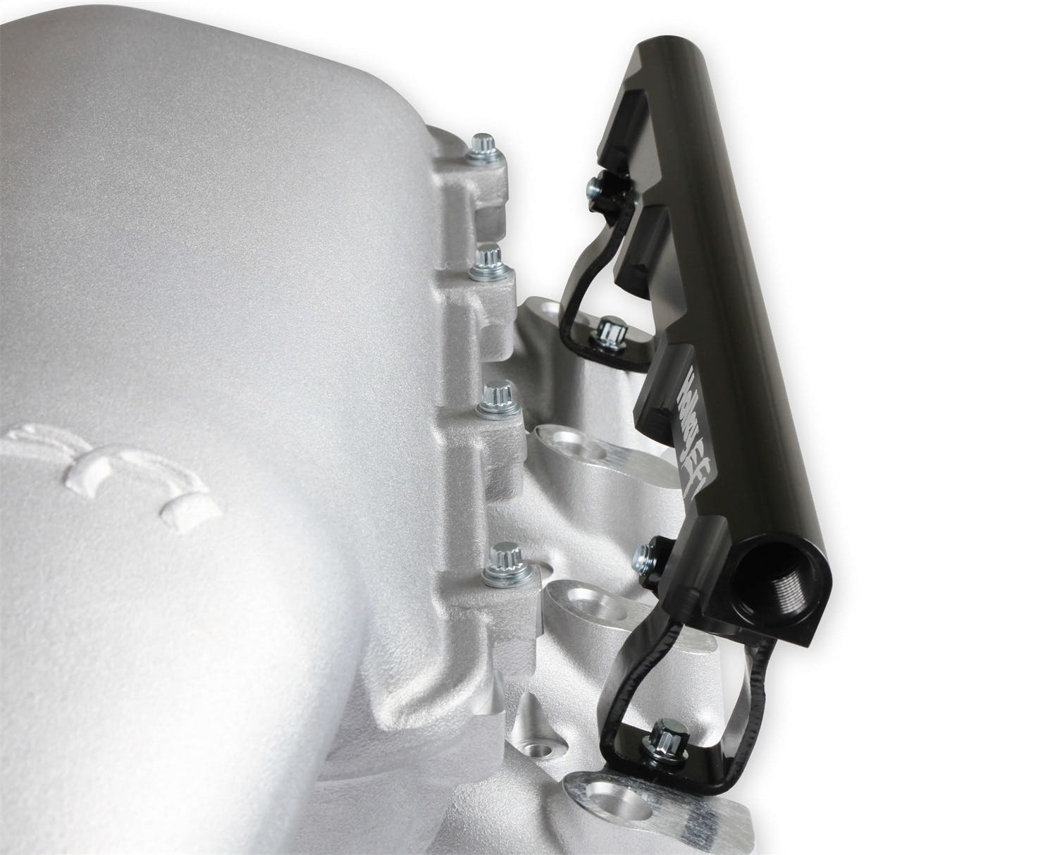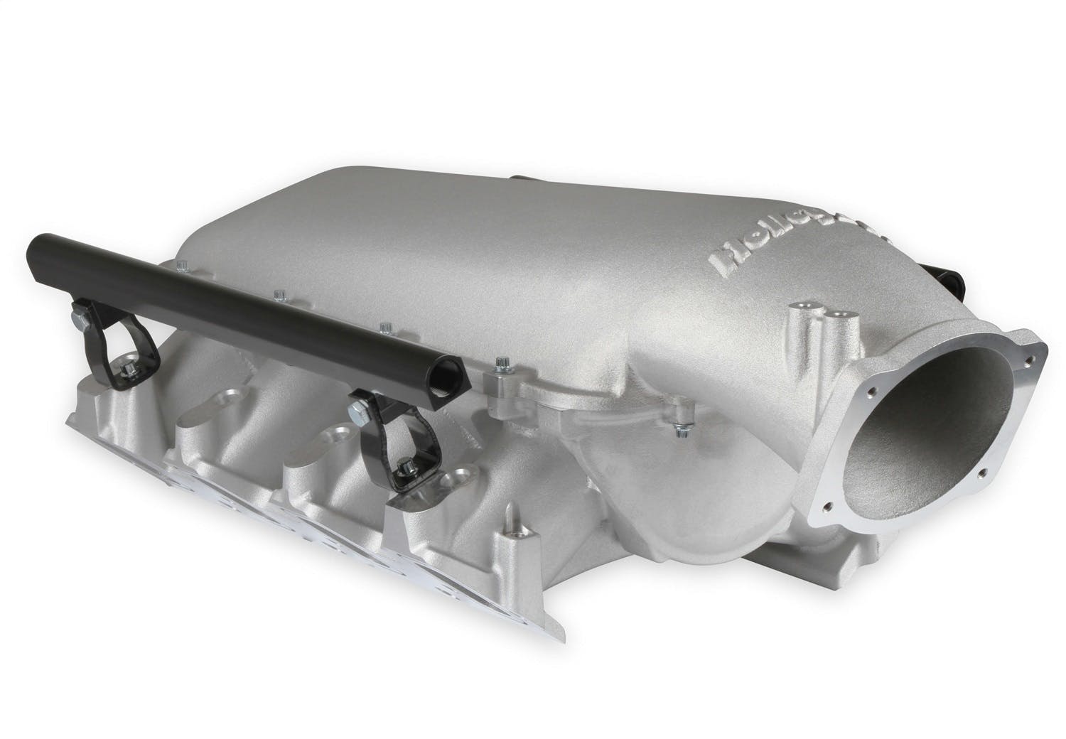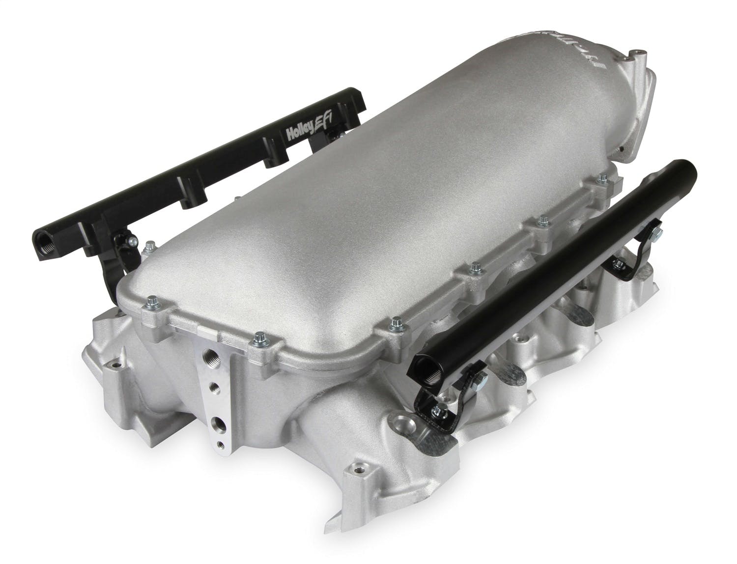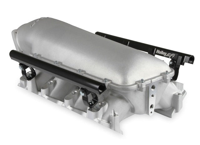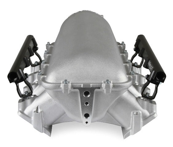 The Holley LS3 Lo-Ram intake manifold kits are designed for GM LS Gen III and IV engines equipped with GM LS3/L92 cylinder heads. These intake manifolds will work with OE or aftermarket cylinder heads. The Lo-Ram intake manifolds are designed for forced induction (supercharged or turbocharged) engine applications and the 105 mm throttle body part number 112-581 or similar models. The base intake manifold is designed with a low height to aid the packaging of a plenum mounted air-to-water intercooler in a top-feed configuration. Additional manifold designs include both single and dual injector options. Available with both as-cast satin and black power-coat finishes. High volume fuel rails for eight and sixteen injector configurations. Mounting hardware included with 3/4-16 O-ring ports (8 AN)