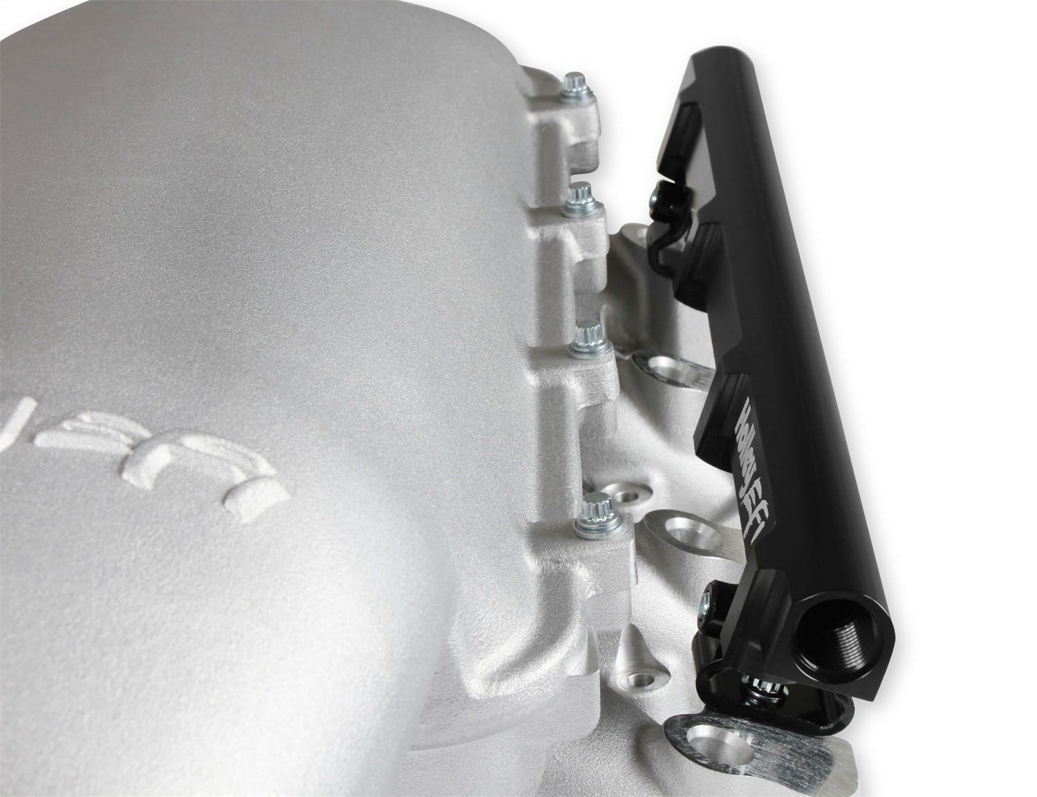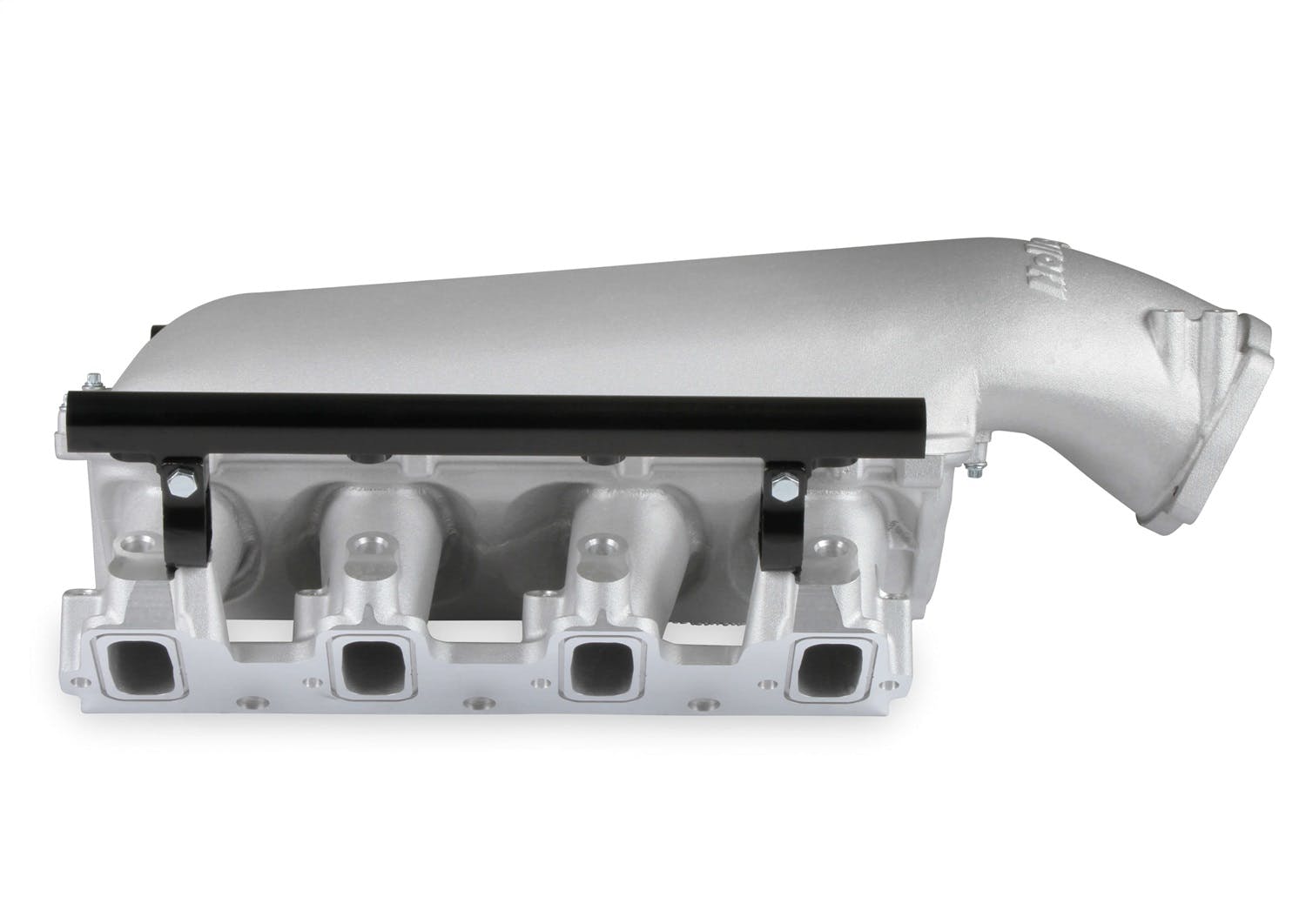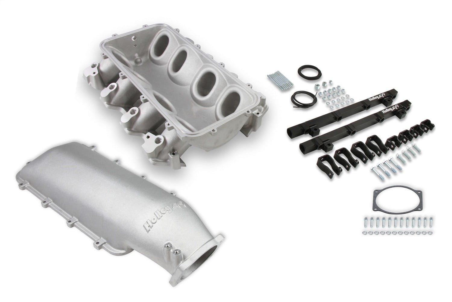 The Holley LS3 Lo-Ram intake manifold kits are designed for GM LS Gen III and IV engines equipped with GM LS3/L92 cylinder heads. These intake manifolds will work with OE or aftermarket cylinder heads. The Lo-Ram intake manifolds are designed for forced induction (supercharged or turbocharged) engine applications and the 105 mm throttle body part number 112-581 or similar models. The base intake manifold is designed with a low height to aid the packaging of a plenum mounted air-to-water intercooler in a top-feed configuration. Additional manifold designs include both single and dual injector options. Available with both as-cast satin and black power-coat finishes. High volume fuel rails for eight and sixteen injector configurations. Mounting hardware included with 3/4-16 O-ring ports (8 AN)