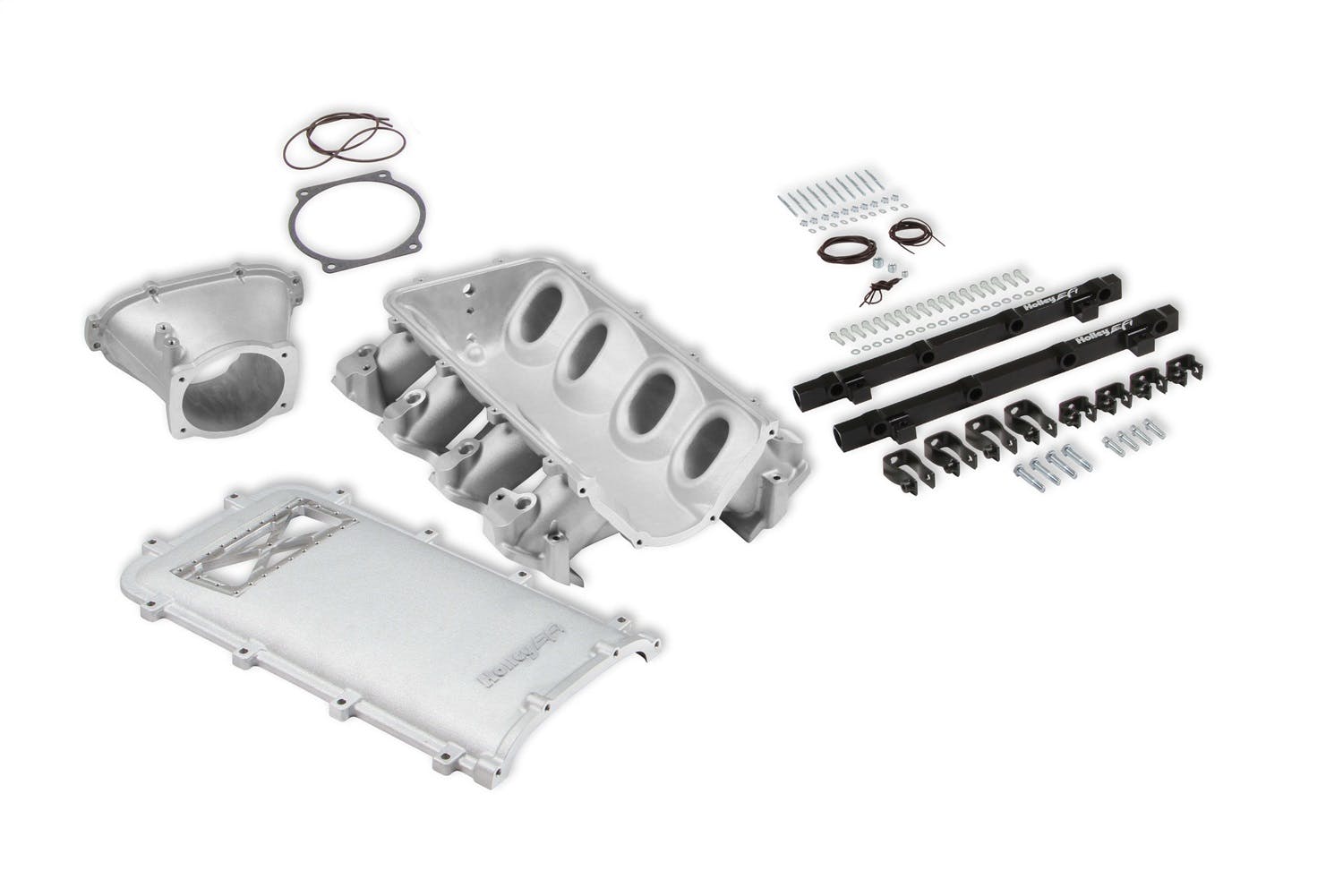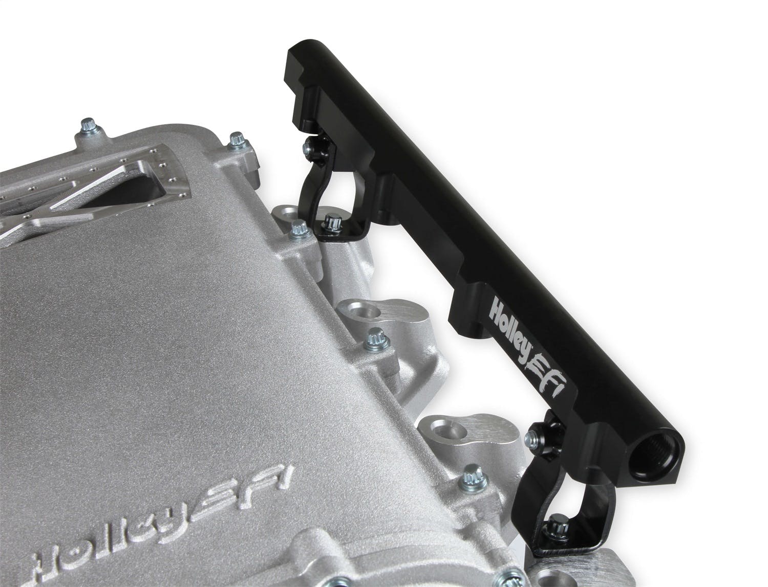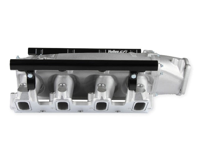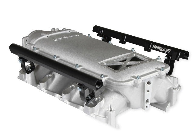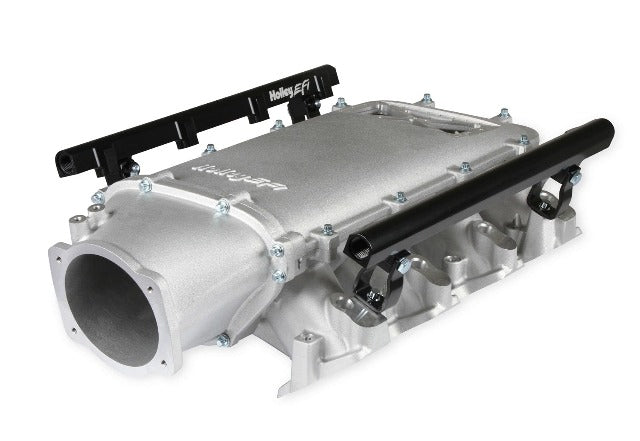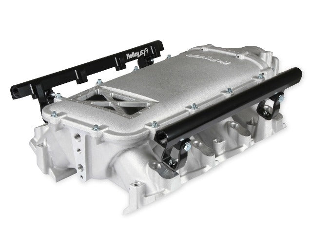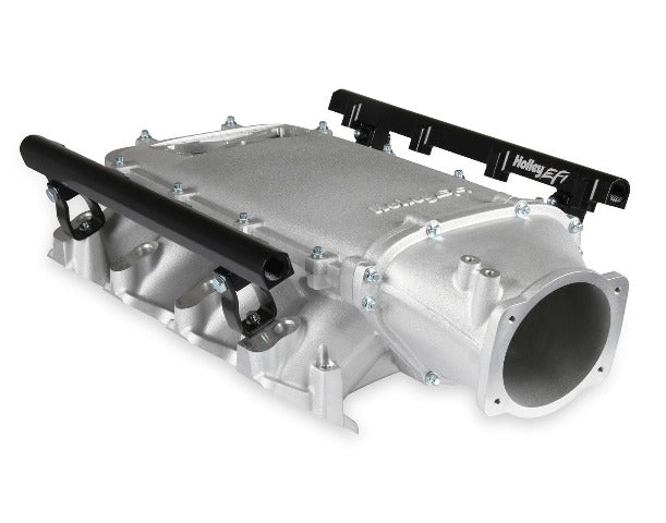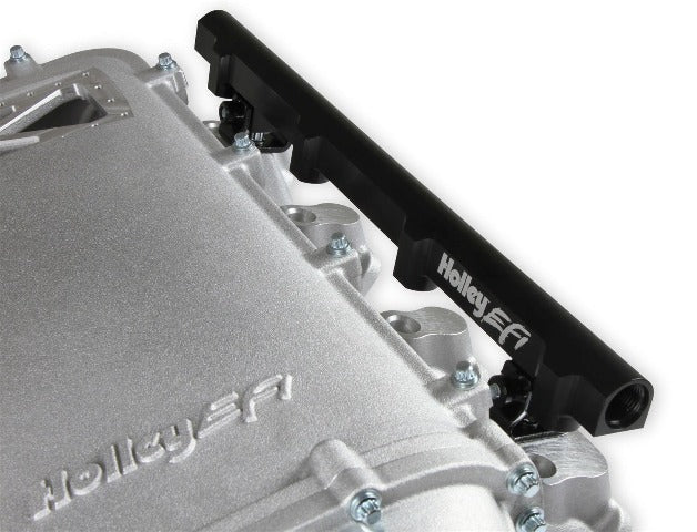 Available with single or dual injector provisions and a burst panel flange, the LS3 Ultra Lo-Ram intake manifold is designed for boosted combinations with hood clearance in mind. The Holley LS3 Ultra Lo-Ram intake manifold kits are designed for GM LS Gen III and IV engines equipped with GM LS3/L92 cylinder heads. These intake manifolds will work with OE or aftermarket cylinder heads. The Lo-Ram intake manifolds are designed for forced induction (supercharged or turbocharged) engine applications with peak power at 7000-8000 rpm depending on the application. The front entry plenum flange has a 105 mm opening to work with throttle body part number 112-581 or similar models. The base intake manifold is designed with a lower overall height to fit under a stock or mildly modified hood. The LS3 Ultra Lo-Ram is constructed to provide a very low profile modular intake manifold suitable for fabrication of special throttle body adapters or inlet ducts for custom installations. Available with single or dual injector provisions and a burst panel flange options.The fuel rail kits come with two sets of brackets. A set for long (usually standard length) fuel injectors and a set for short (such as Pico, or LS7) fuel injectors.