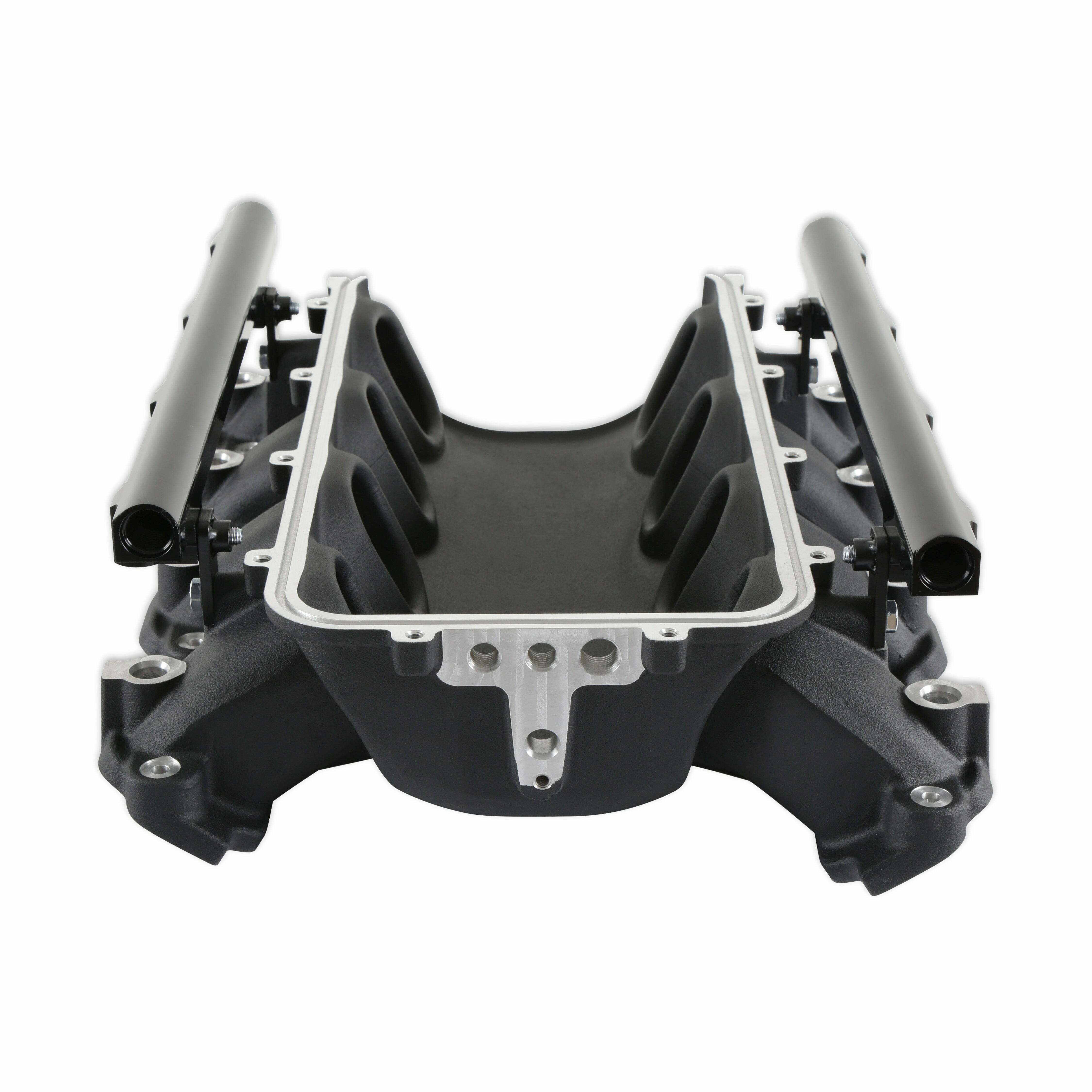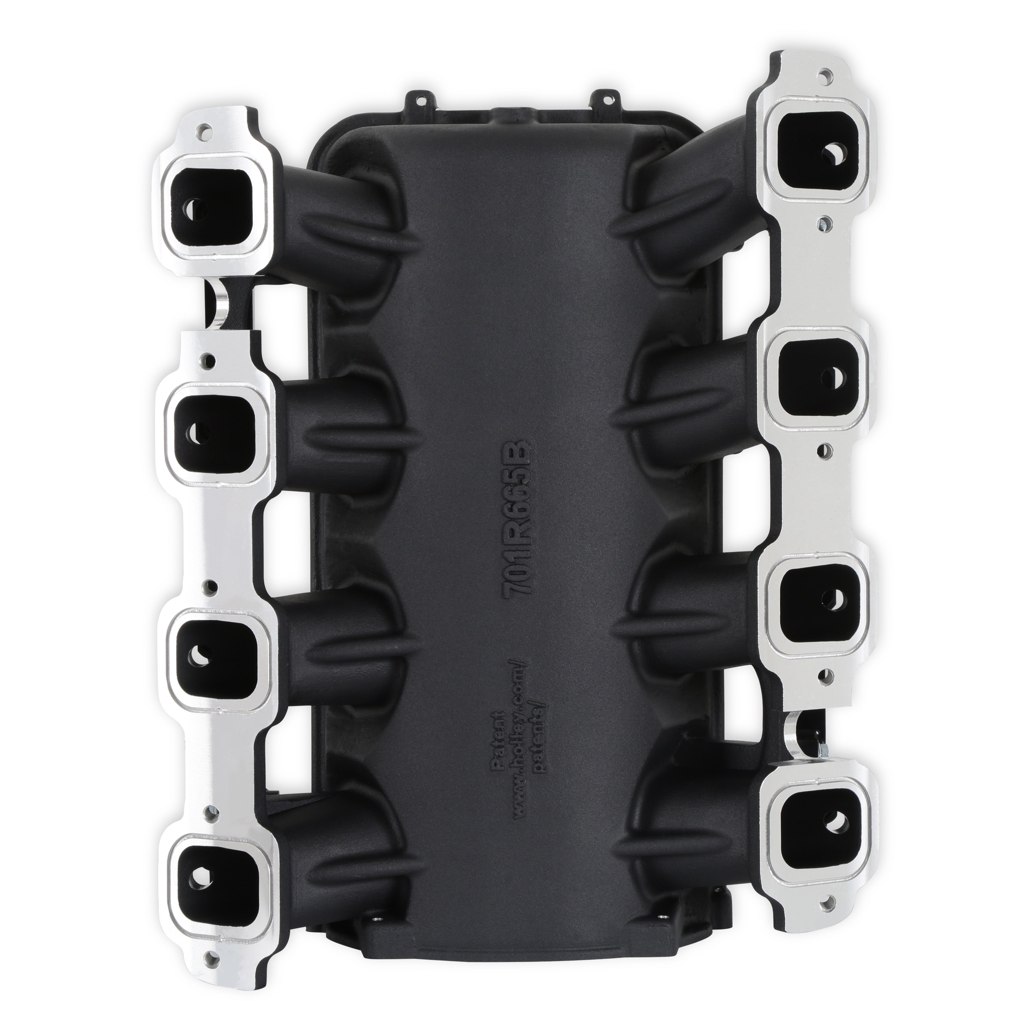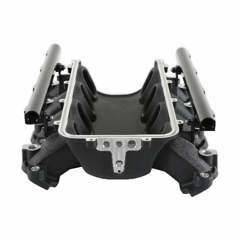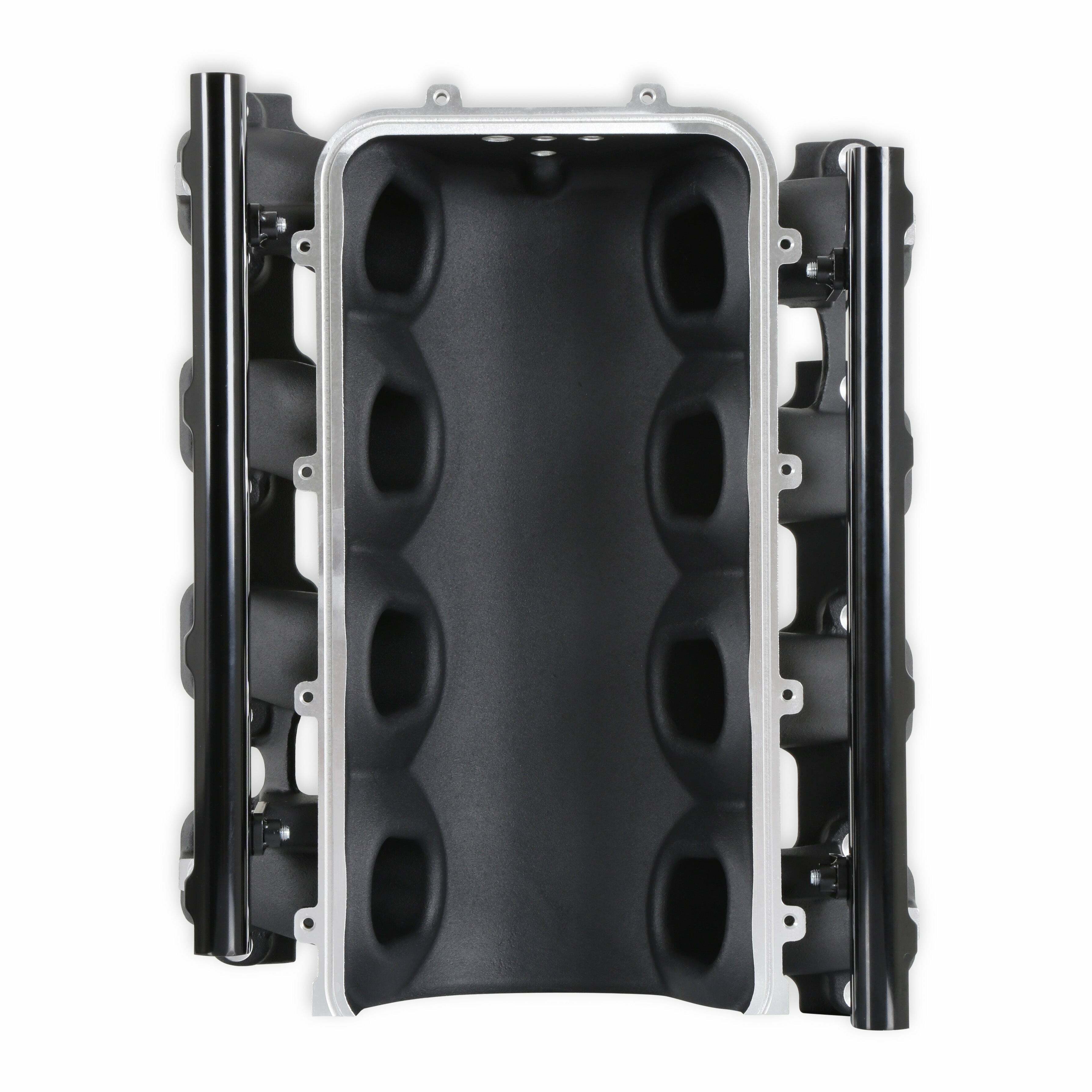 BASE IM, LT LO-RAM, W-PORT F.I. BLACK;Holley Ultra Lo-Ram Manifold Base and Port Injection Fuel Rails- GM Gen V LT;Front-Feed - With Port Injection - Black Finish;The Holley GM Gen V LT Ultra Lo-Ram intake manifold kits are designed for GM Gen V LT engines equipped with GM LT cylinder heads. These intake manifolds will work with OE or aftermarket cylinder heads. The Ultra Lo-Ram intake manifolds are designed for forced induction (supercharged or turbocharged) engine applications with peak power at 7,000-8,000 rpm depending on the application. The front entry throttle body flange has a 105mm opening to work with throttle body part number 112-581 or similar models. The front-feed base intake manifold is designed with a lower overall height to fit under a stock or mildly modified hood. The Ultra Lo-Ram provides a very low-profile modular intake manifold along with various fabrication flanges to aid the fabrication of special throttle body adapters or inlet ducts for custom installations. Available for OE direct fuel injection only and with port fuel injection provisions and a burst panel flange options. For the port fuel injection option, the high volume -8AN fuel rail kit includes hardware and brackets to accommodate long (usually standard length) fuel injectors or short (such as Pico, or LS7) fuel injectors.;Designed for GM Gen V engines equipped with GM LT type cylinder heads;105mm diameter throttle body opening accepts OEM 4-bolt LS/LT DBW or Holley LS/LT throttle bodies;Engineered for forced induction (supercharged or turbocharged) engine applications with peak power at 7,000-8,000 rpm depending on the application;Only 0.97-inch taller than a factory LT1 manifold provides maximum clearance under a stock or mildly modified hood;Modular design & front entry plenum flange allows design & fabrication of special throttle body adapters or inlet ducts for custom installations. Base manifold, plenum top, throttle body adapter available as separate kits;Clears C7 Corvette cowls and hoods without modification;Available for OE direct fuel injection only or with added port fuel injection provisions;Kits with port injection provide high volume fuel rails with 3/4-16 O-ring ports (8 AN). Mounting hardware is included;Ultra Lo-Ram kits with a burst panel flange are available, Ultra Lo-Ram billet burst panel duct is offered separately (PN: 300-608 clear anodized, PN: 300-608BK black anodized);As-cast aluminum (Satin) and black powder coat finishes available