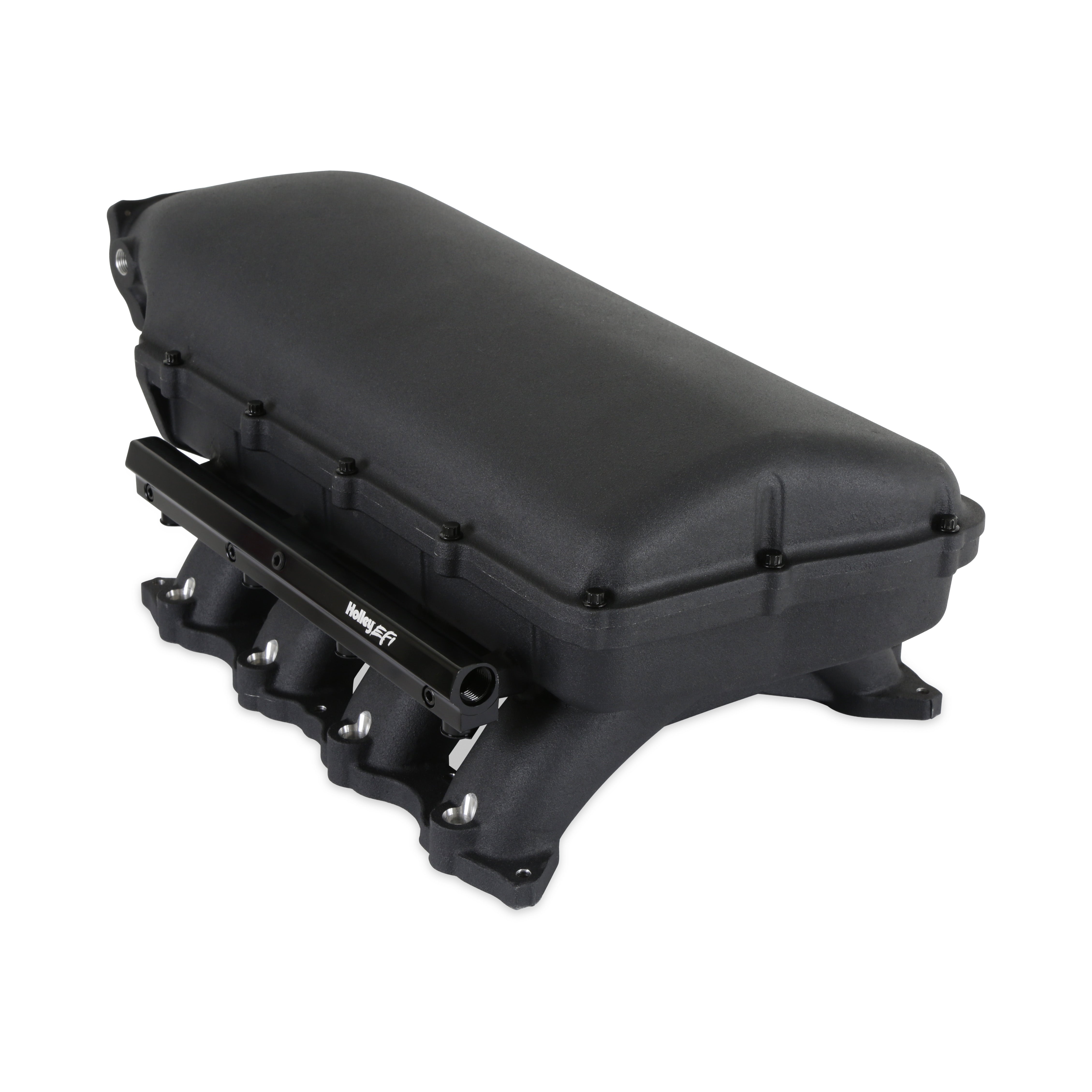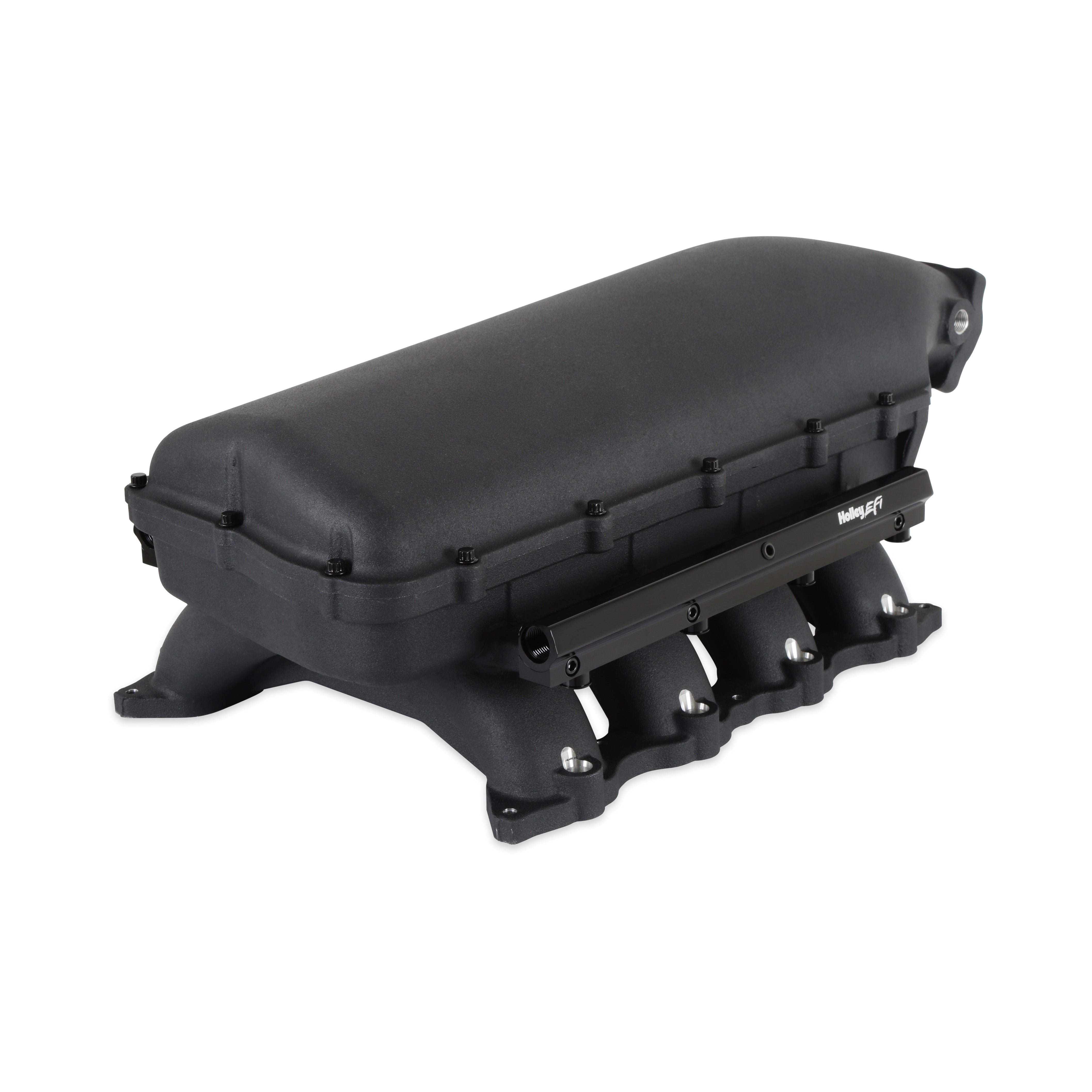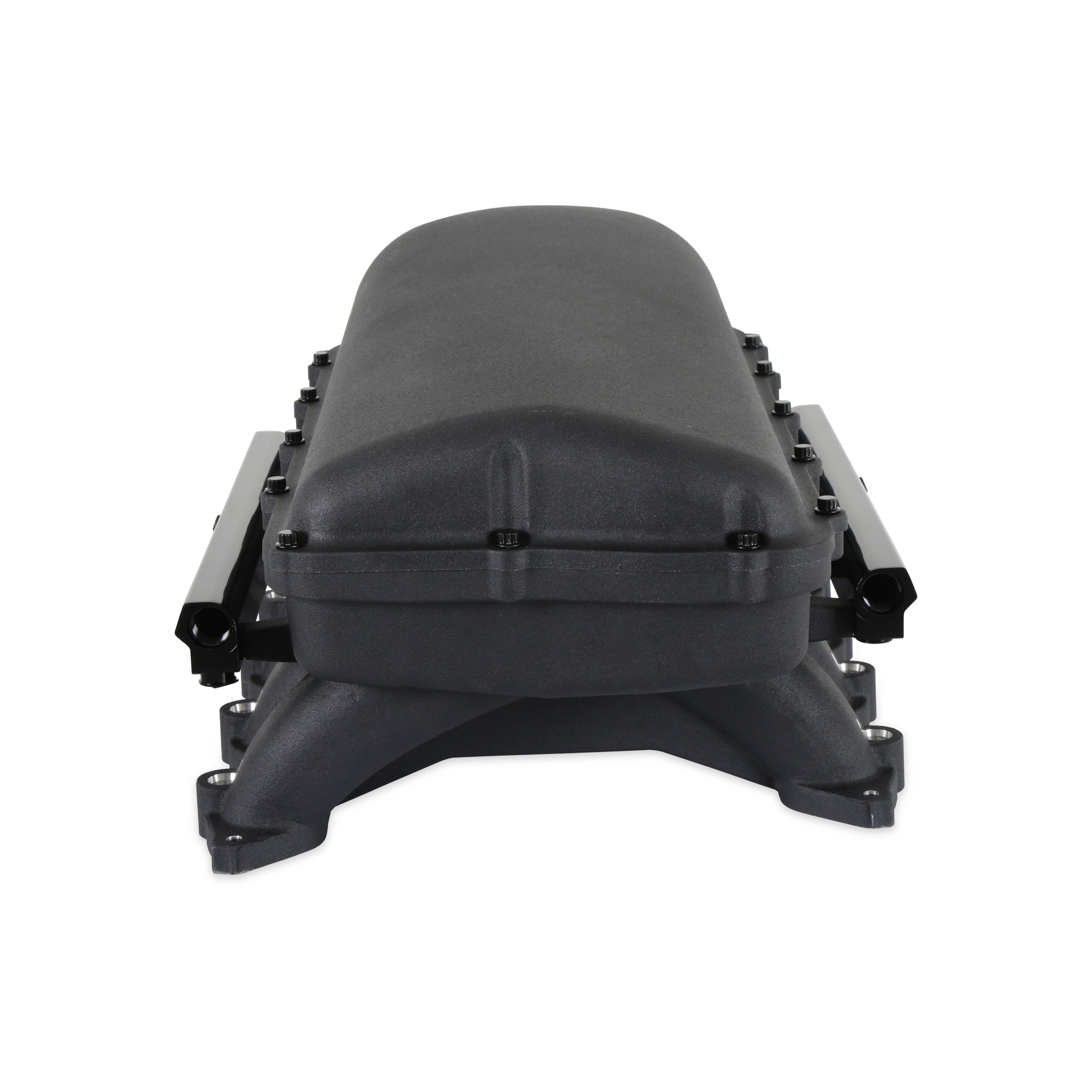HI-RAM FORD COYOTE BLACK;2007-2014 GT500 Throttle;Finally, an affordable Coyote intake manifold that also performs! The Hi-Ram and Ultra Lo-Ram are designed to fit stock bolt pattern OE heads found on the 2011-2023 Ford 5.0 Coyotes and related engine families, such as, Voodoo and Predators. These kits include fuel rails for use with OEM type fuel injectors and clips, mounting hardware, and O-ring gaskets. Offered in black and natural as-cast finish, both manifolds have a 9.20-inch runner length and are designed to improve the mid to high RPM powerband. The Ultra Lo-Ram provides an additional 19.4mm front and 42.6mm rear clearance compared to the Ford Performance Cobra Jet manifold, plus clears 2015-2023 Mustang factory hoods. Offered in both round and oval throttle body configurations, with replacement front inlets for easy interchangeability. The oval inlet can accommodate up to a 150x66mm single throttle body and 93mm on the round variant. Round inlets include standard mounting provisions for GT350, GT500, and LS 4-bolt throttle bodies. 2011-2023 GT throttle bodies can be used with the optional 717-18 adaptor. The aggressively designed Hi-Ram is constructed in a two-piece design to accommodate for air to water intercoolers and feature up to 20% more plenum volume versus Ultra Lo Rams. This manifold design is only offered in an oval throttle body configuration.;As-cast aluminum construction: more durable for boosted applications, can be welded for modifications;Modular design: accessible runner entries for porting, allows accessories like intercoolers and nitrous plates;300-911 and 300-912 Ultra Lo-Ram will fit under stock hood with stock engine mounts in 2015-23 Mustang;Refined port design with streamlined injector boss for reduced turbulence without loss of flow area;Allows a variety of throttle valves including large monoblade, 2015-20 GT350, 2007-14 GT500, 2019-23 GT500, GM LS 4 bolt, 2011-23 Ford Mustang GT (with optional adapter 717-18);Fuel rails with -8AN ports and dual 1/8 NPT accessory ports for gauges or Gen 3 direct injection fuel line hookup;300-911 and 300-912 front inlets can be interchanged between round and oval with service parts;Plenum Volumes: 300-910 9.8-liters, 300-911 8.4-liters, 300-912 8.2-liters;Two 1/8 NPT ports on all manifolds. Two 3/8 NPT ports on all manifolds, except 300-911 has one