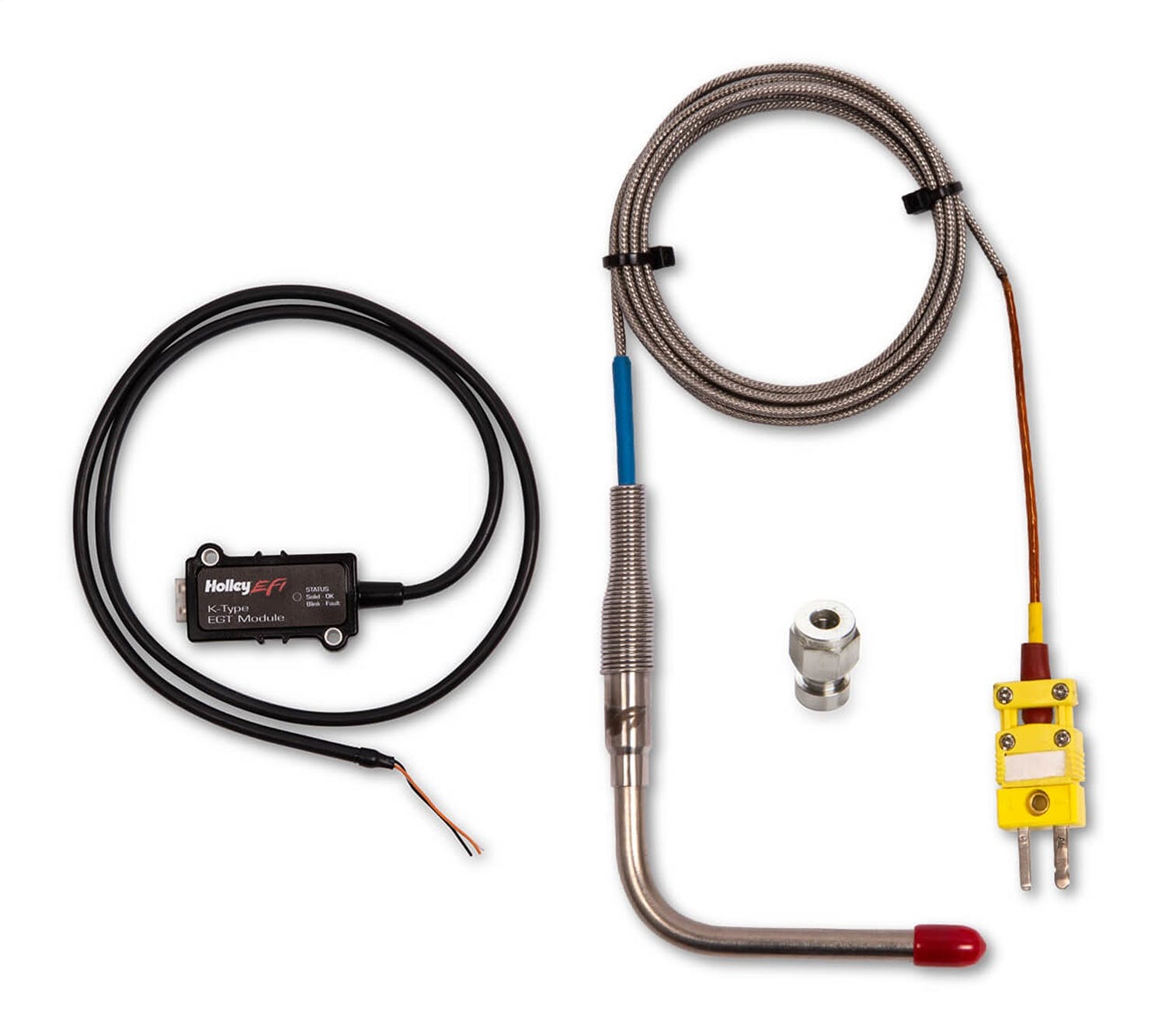 Introducing the Holley EFI Single Channel EGT Kits. Exhaust Gas Temperature data is critical information when your engine tune up is on the ragged edge. Knowing the exhaust temperature can help you identify potential horsepower left on the table, or pin point any weak links in your max effort race engine. You can also use this data to quickly identify a potential ignition misfire, or stuck injector! The included sensor is designed to work with any engine combination, with an open reinforced tip for the fastest response rate, and improved shielding. The included probe features a 60 lead and pre-terminated connector, ensuring it can be installed in almost any location. The included 316 stainless steel bungs feature a built in step, making bung installation as easy as possible. Everything needed to upgrade your exhaust system is included, such as 1/4 316 Stainless Steel EGT Bung, 1 EGT Probe, and either a Single Channel CANBus EGT Controller for Holley EFI, or Single Channel Analog EGT Controller, for universal installations!