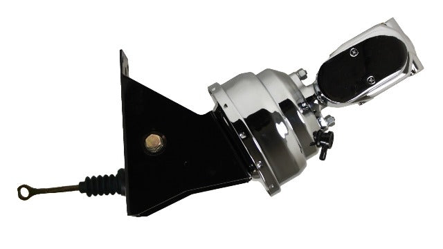 New 8" Dual Diaphragm chrome plated power brake booster kit. This 8" power booster is hand polished before a chrome plated finish is applied for a top quality finish. The black powder coated mount and pushrod assembly is a direct fit to your factory firewall for that fresh factory look. Also Included in this kit is a new 1" bore master cylinder perfect for most front disc /rear drum or 4 wheel disc brake applications.