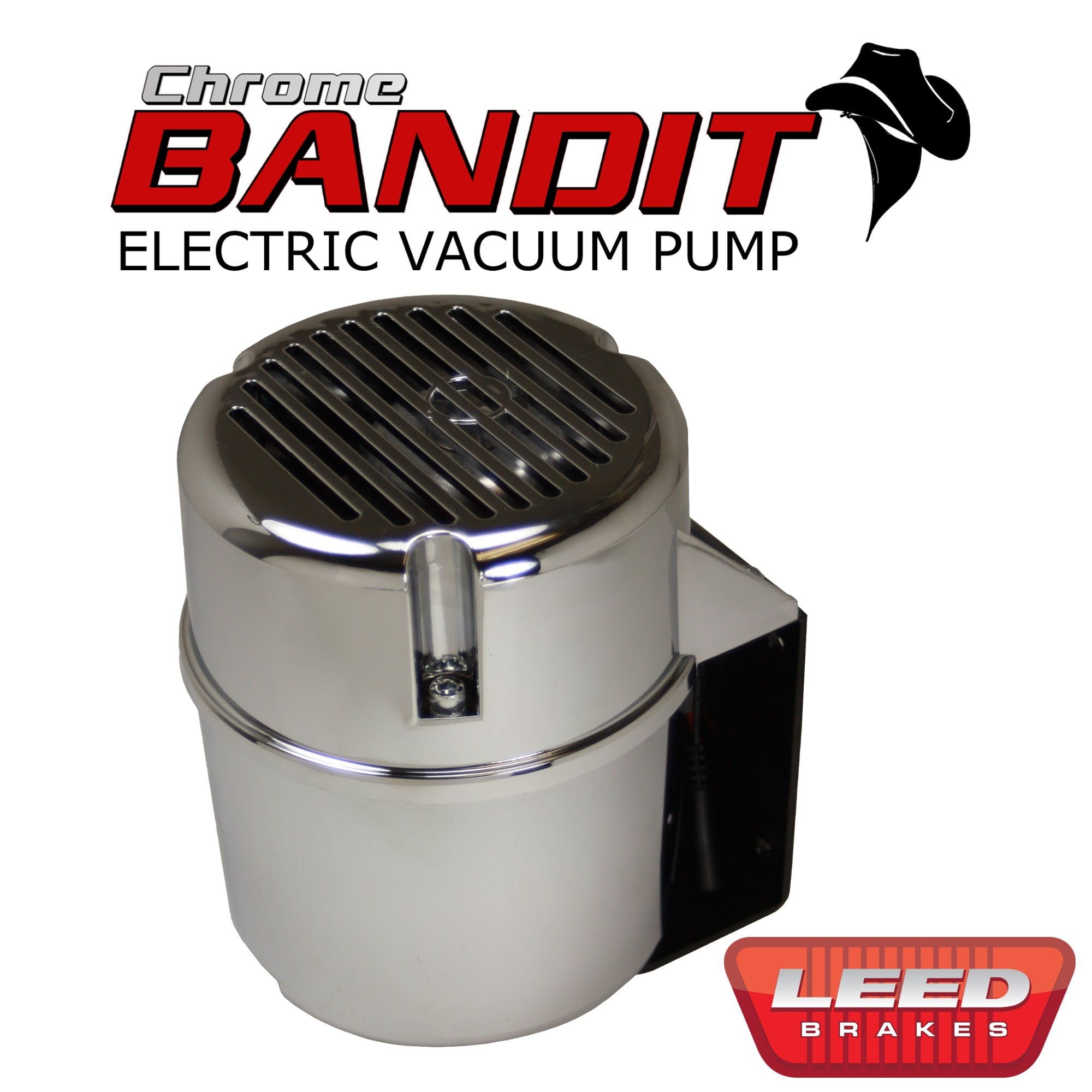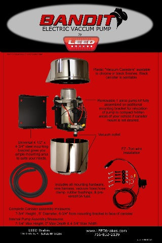 Leed Brakes rotary electric vacuum pump kit. Provided 24 inches of quiet reliable vacuum for the power brake booster on vehicles with low engine vacuum. Easy 2 wire installation. Includes all hardware, hose and detailed instructions.