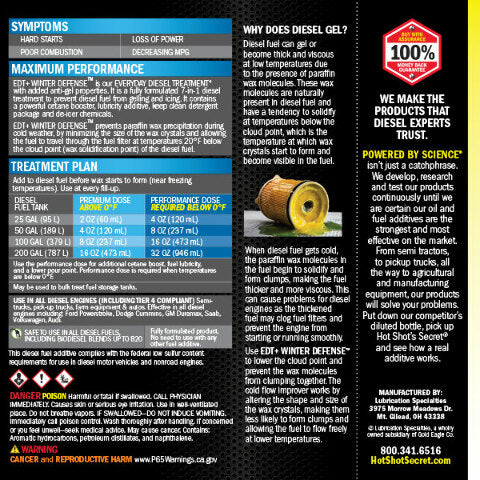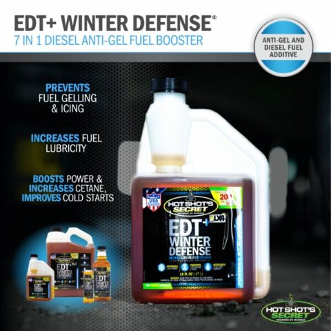 EDT+ WINTER DEFENSE is our EVERYDAY DIESEL TREATMENT with added anti-gel properties. It is a fully formulated 7-in-1 diesel treatment to prevent diesel fuel from gelling and icing. It contains a powerful cetane booster, LX4 lubricity additive, keep-clean detergent package and de-icer chemicals.