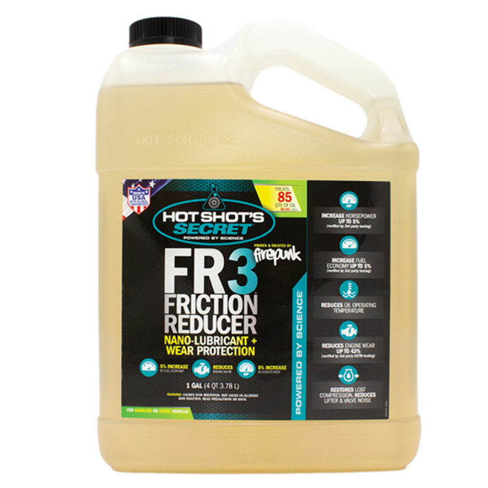 Hot Shot’s Secret FR3 Friction Reducer is a one-of-a-kind, 100% synthetic oil additive that improves performance and protects engines. This engine friction reducer is blended with three patented lubricants, including a nano lubricant, and is proven to reduce engine wear by up to 43% plus improve your vehicle’s performance by increasing horsepower and fuel economy up to 5% each.