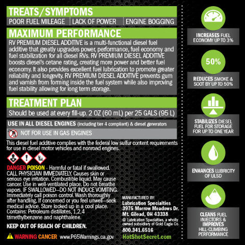 RV PREMIUM DIESEL ADDITIVE is a multi-functional diesel fuel additive that greatly upgrades power, performance, fuel economy and fuel stabilization for all diesel RVs.