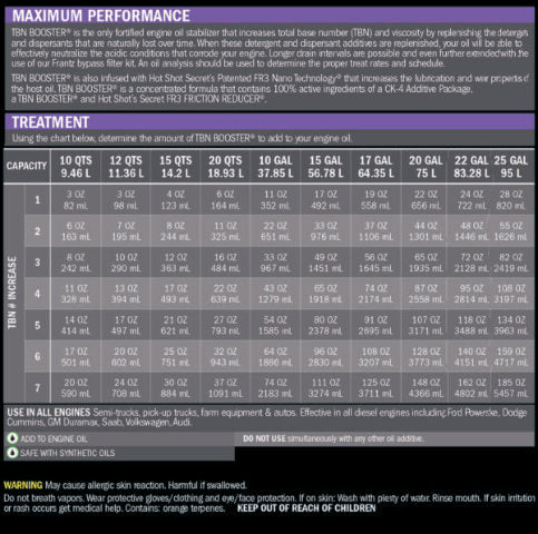 The treatment rate varies, depending on the desired TBN increase, initial Total Base Number, and the oil capacity of your engine. The following guide is included for common diesel pickup truck engines.