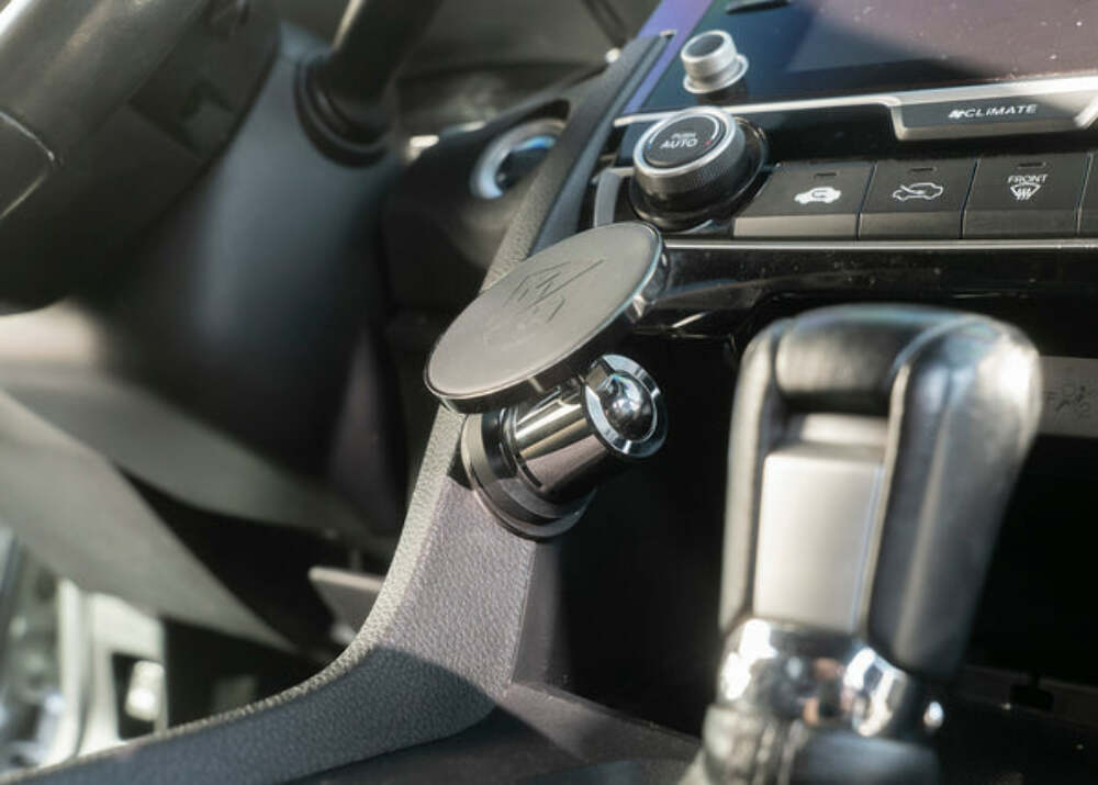 Device Mounting Type: Non-Charging MagSafe compatible magnet array, with Adhesive Mounting Disc for non-MagSafe phones, with up to 90 degrees tilt Mounting Base: Notched Billet Aluminum Ball-Housing with 90lb Pull-Force Magnet Product Dimensions: 1.5" x 2.625"