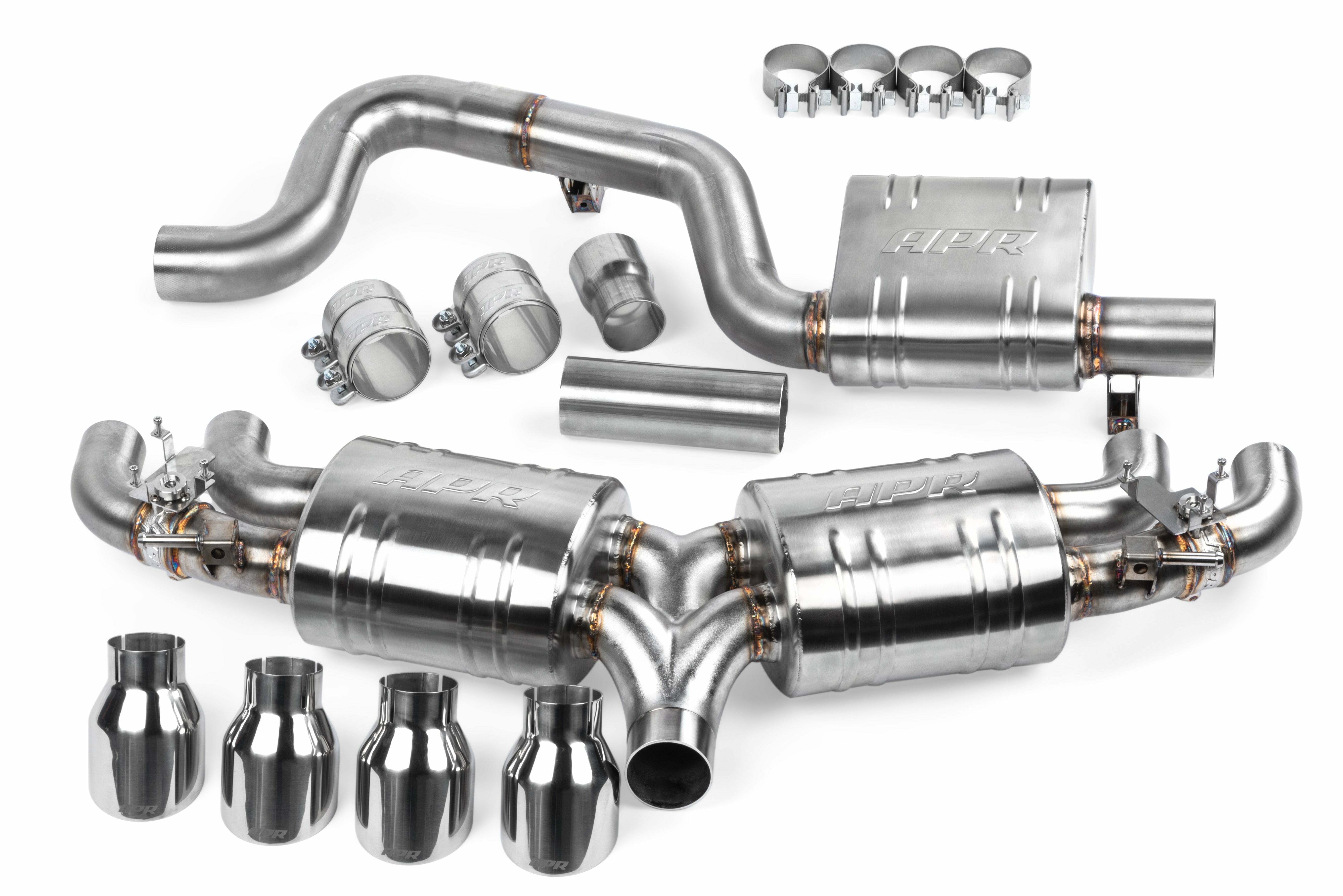 The APR Catback Exhaust System personalizes your vehicle's looks, sound and performance. Beautifully hand-crafted T304-stainless-steel components adorn the system with stunning TIG-welding throughout. Our straight-through brushed-finished mufflers are configurable to your desire, smoothing the exhaust note to a deep growl, without adding restrictions, rasp or drone. Strong high-quality bracketry and OEM-style clamps hold the system steadily in place, making the install or removal a snap, and fitment simple, yet precise. A cast 3" to dual 2.5" rear splitter creates an ultra-smooth transition, steadily feeding exhaust gasses out of the system, while looking tidy from under the rear bumper. Finally, removable 4" polished slash-cut exhaust tips finish the system, adding a classy motorsport-inspired touch to the rear of the vehicle.