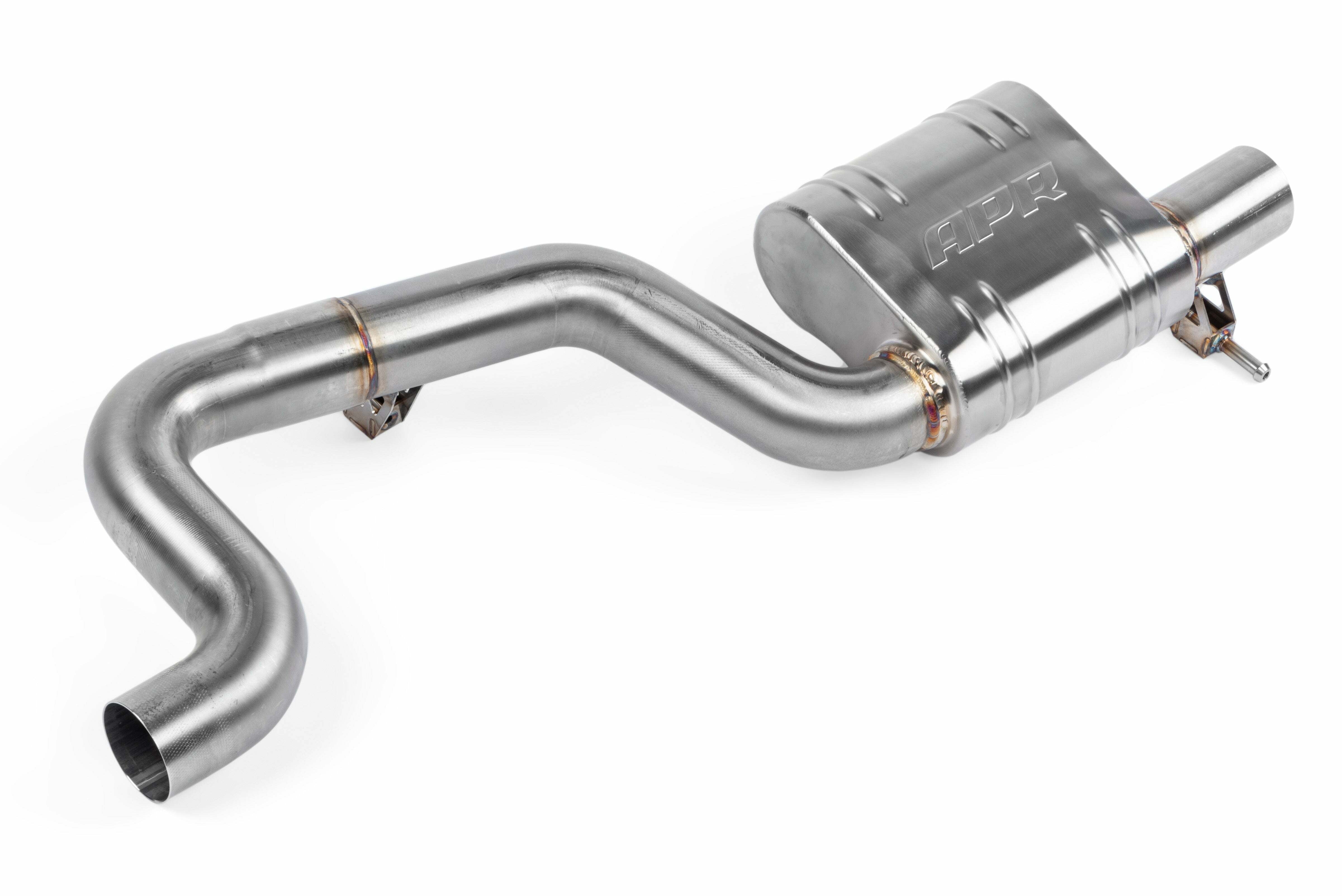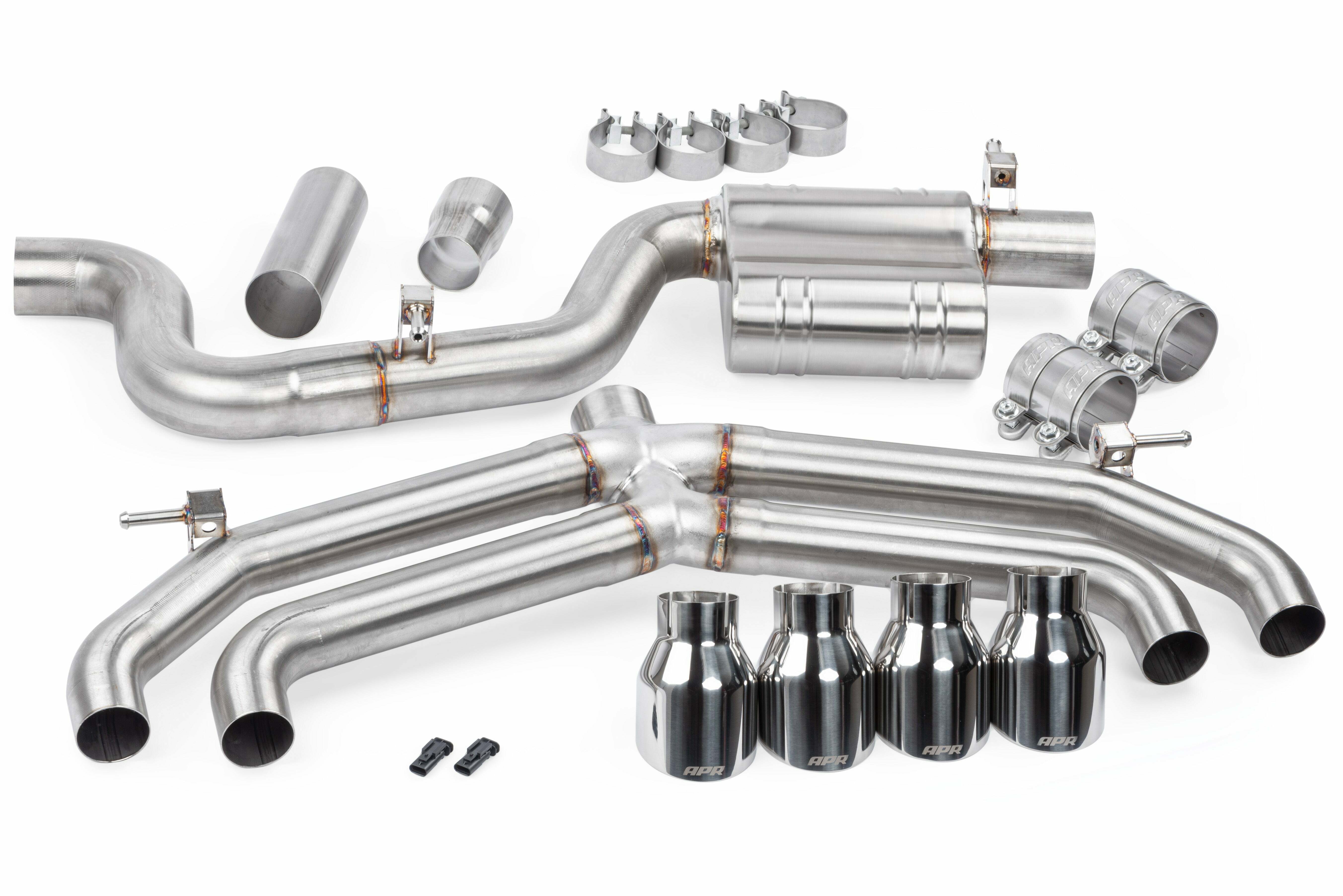 The APR Catback Exhaust System personalizes your vehicle's looks, sound and performance. Beautifully hand-crafted T304-stainless-steel components adorn the system with stunning TIG-welding throughout. Our straight-through brushed-finished mufflers are configurable to your desire, smoothing the exhaust note to a deep growl, without adding restrictions, rasp or drone. Strong high-quality bracketry and OEM-style clamps hold the system steadily in place, making the install or removal a snap, and fitment simple, yet precise. A cast 3" to dual 2.5" rear splitter creates an ultra-smooth transition, steadily feeding exhaust gasses out of the system, while looking tidy from under the rear bumper. Finally, removable 4" polished slash-cut exhaust tips finish the system, adding a classy motorsport-inspired touch to the rear of the vehicle.