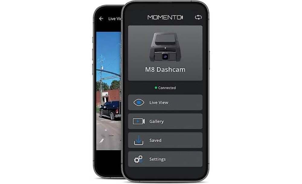 The M8 Pro dash cam works with the free Momento app, which is compatible with Android and Apple phones. With the app, you can download footage, get a live view from the car, and wirelessly install firmware updates for your dash cam as soon as they come out. A 64 GB SD card physically backs up the footage as well. This is a great feature, as many companies require a subscription for full coverage or live-view monitoring.
