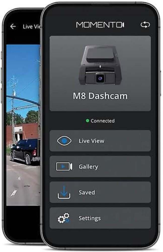 The M8 Max dash cam works with the free Momento app, which is compatible with Android and Apple phones. With the app, you can download footage, get a live view from the car, and wirelessly install firmware updates for your dash cam as soon as they come out. A 64 GB microSD card physically backs up the footage as well. This is a great feature, as many companies require a subscription for full coverage or live-view monitoring.
