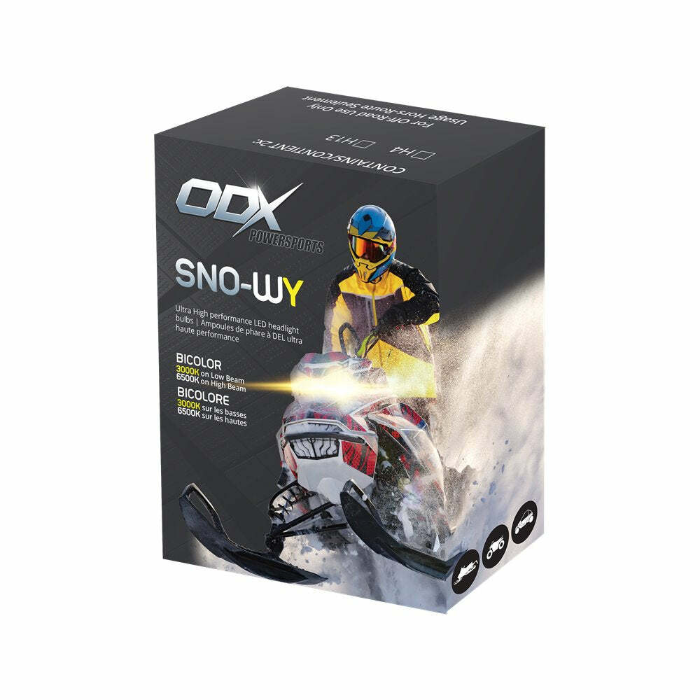 The ODX high-performance SNO-WY Bicolor LED bulb is the smartest LED designed specifically for snowmobiles. The bulb features a powerful 3000K LED light on the low beams and switches to 6500K on the high beams. Don’t get blinded in trails during snow storms or when you follow your companions. The 3000K light penetrates deeper through the snow and fog and will guide your way without creating a blinding white wall of snow. The LED chips are fan cooled and the kit is comparable to 8000 lumens. The ODX SNO-WY is only available in H4 or H13. Our SNO-WY series is covered by our lifetime warranty.