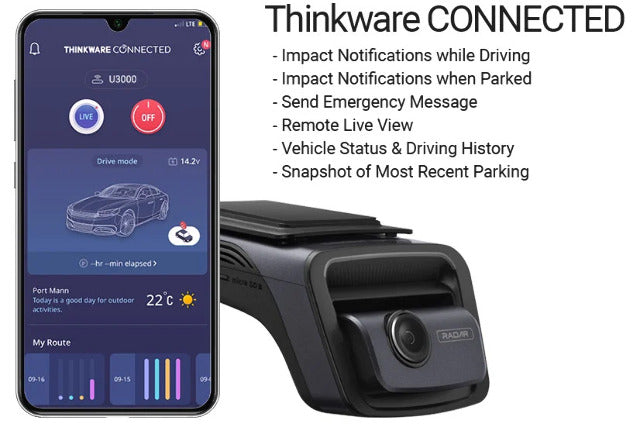 Receive impact notifications or monitor remotely what’s happening around your vehicle via your smartphone with the THINKWARE CONNECTED app*. When the U3000 is connected to the internet, the dedicated THINKWARE CONNECTED app gives you access to the following features: