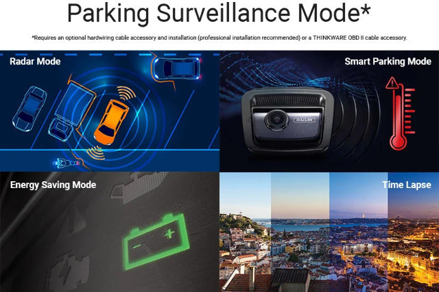 *Requires Hardwiring Cable or OBD II Power Cable and installation for Parking Surveillance mode (professional installation recommended)